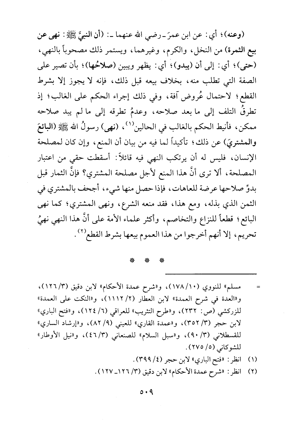 (وعنه)؛ أي: عن ابن عمرَ - رضي الله عنهما -: (أن النبيَّ - صلى الله عليه وسلم -: نهى عن بيع الثمرة) من النخل، والكرم، وغيرهما، ويستمر ذلك مصحوبًا بالنهي، (حتى)؛ أي: إلى أن (يبدو)، أي: يظهر ويبين (صلاحُها)، بأن تصير على الصفة التي تطلب منه، بخلاف بيعه قبل ذلك، فإنه لا يجوز إلا بشرط القطع، لاحتمال عُروض آفة، وفي ذلك إجراء الحكم على الغالب، إذ تطرقُ التلف إلى ما بعد صلاحه، وعدمُ تطرقه إلى ما لم يبد صلاحه ممكن، فأنيط الحكم بالغالب في الحالين (١)، (نهى) رسولُ الله - صلى الله عليه وسلم - (البائعَ والمشتريَ) عن ذلك، تأكيدًا لما فيه من بيان أن المنع، وإن كان لمصلحة الإنسان، فليس له أن يرتكب النهي فيه قائلًا: أسقطت حقي من اعتبار المصلحة، ألا ترى أنَّ هذا المنع لأجل مصلحة المشتري؟ فإنَّ الثمار قبل بدوِّ صلاحها عرضة للعاهات، فإذا حصل منها شيء، أجحف بالمشتري في الثمن الذي بذله، ومع هذا، فقد منعه الشرع، ونهى المشتري، كما نهى البائع، قطعًا للنزاع والتخاصم، وأكثر علماء الأمة على أنَّ هذا النهي نهيُ تحريم، إلا أنهم أخرجوا من هذا العموم بيعها بشرط القطع (٢).