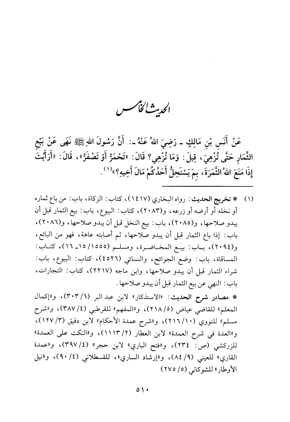 عَنْ أَنَسِ بْنِ مَالِكٍ - رَضِيَ اللهُ عَنْهُ -: أَنَّ رَسُولَ اللهِ - صلى الله عليه وسلم - نَهَى عَنْ بَيْعِ الثِّمَارِ حَتَّى تُزْهِيَ، قِيلَ: وَمَا تُزْهِي؟ قَالَ: "تَحْمَرُّ أَوْ تَصْفَرُّ"، قَالَ: "أَرَأيتَ إِذَا مَنَعَ اللهُ الثَّمَرَةَ، بِمَ يَسْتَحِلُّ أَحَدُكُمْ مَالَ أَخِيهِ؟ " (١).