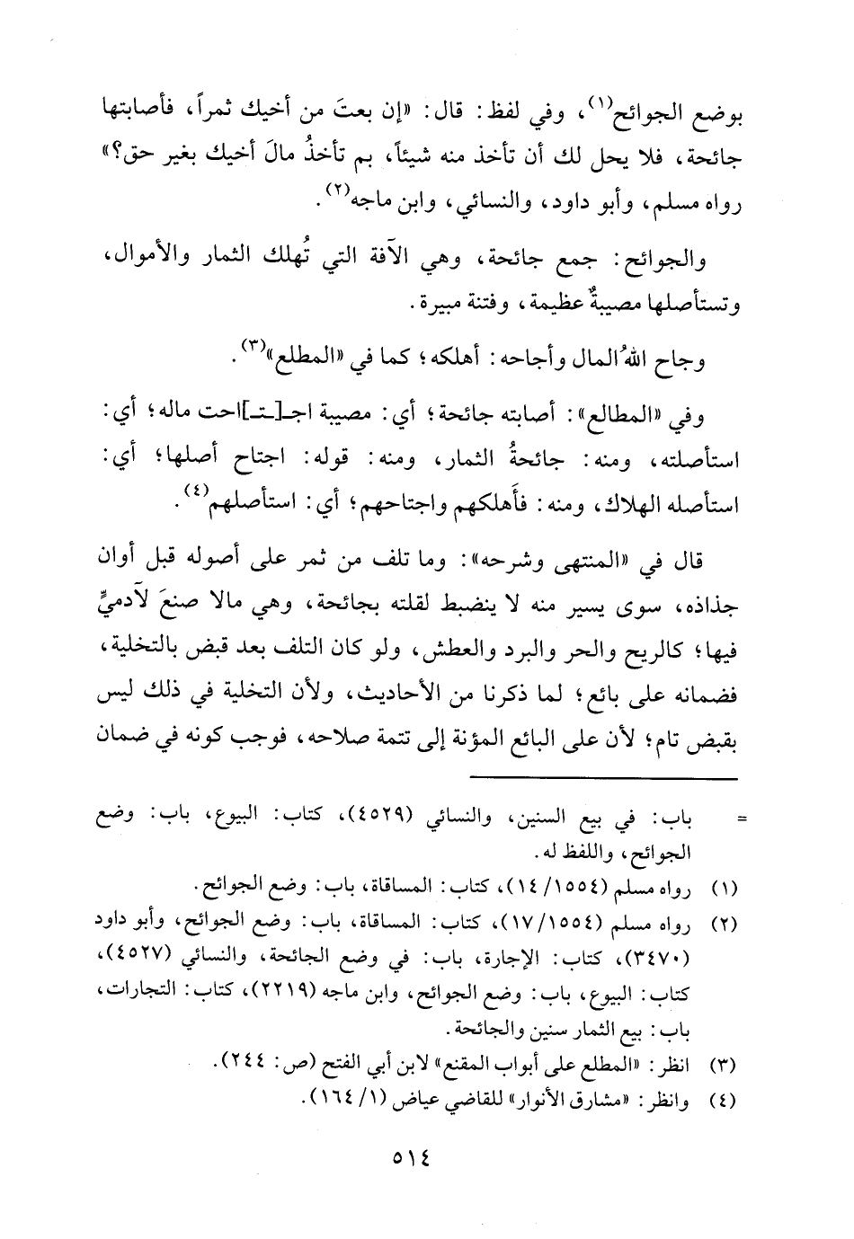 بوضع الجوائح (١)، وفي لفظ: قال: "إن بعتَ من أخيك ثمرًا، فأصابتها جائحة، فلا يحل لك أن تأخذ منه شيئًا، بم تأخذُ مالَ أخيك بغير حق؟ " رواه مسلم، وأبو داود، والنسائي، وابن ماجه (٢).