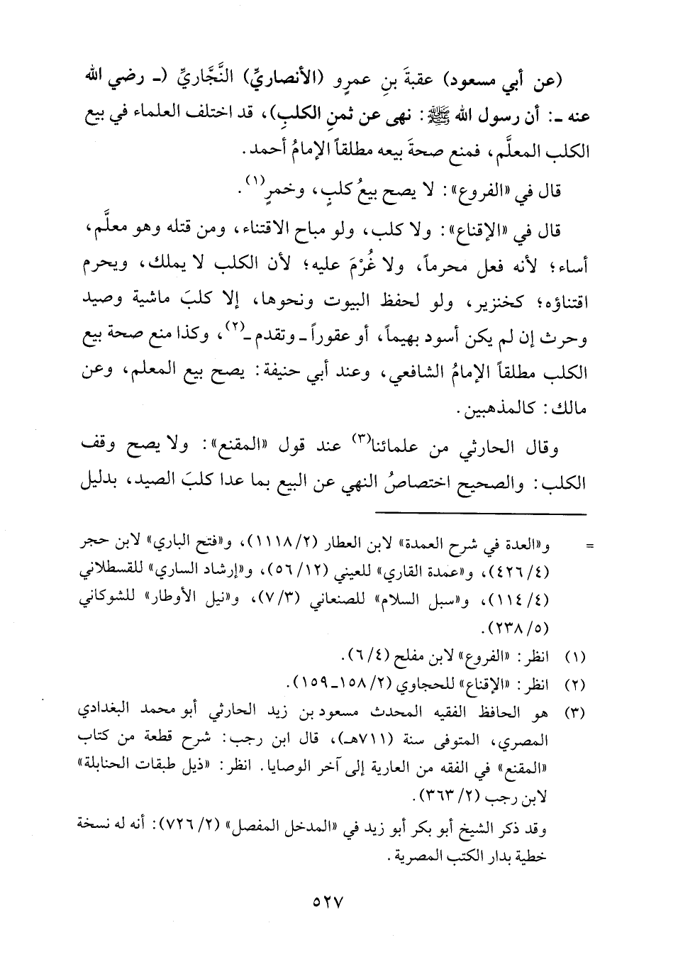 (عن أبي مسعود) عقبةَ بنِ عمرٍ و (الأنصاريِّ) النَّجَّاريِّ (- رضي الله عنه -: أن رسول الله - صلى الله عليه وسلم -: نهى عن ثمنِ الكلبِ)، قد اختلف العلماء في بيع الكلب المعلَّم، فمنع صحةَ بيعه مطلقًا الإمامُ أحمد.