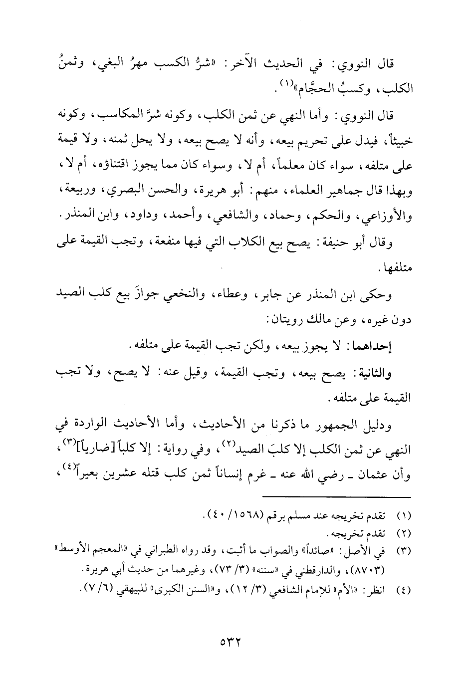 ودليل الجمهور ما ذكرنا من الأحاديث، وأما الأحاديث الواردة في النهي عن ثمن الكلب إلا كلب الصيد (٢)، وفي رواية: إلا كلبًا [ضاريًا] (٣)، وأن عثمان - رضي الله عنه - غرم إنسانًا ثمن كلب قتله عشرين بعيرًا (٤)،