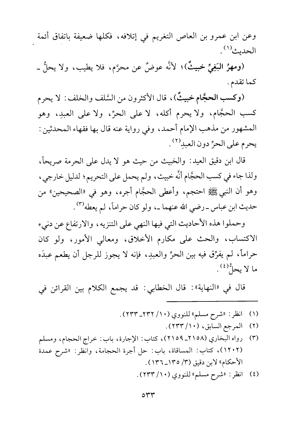 (٣) رواه البخاري (٢١٥٨ - ٢١٥٩)، كتاب: الإجارة، باب: خراج الحجام، ومسلم (١٢٠٢)، كتاب: المساقاة، باب: حل أجرة الحجامة، وأنظر: "شرح عمدة الأحكام" لابن دقيق (٣/ ١٣٥ - ١٣٦).