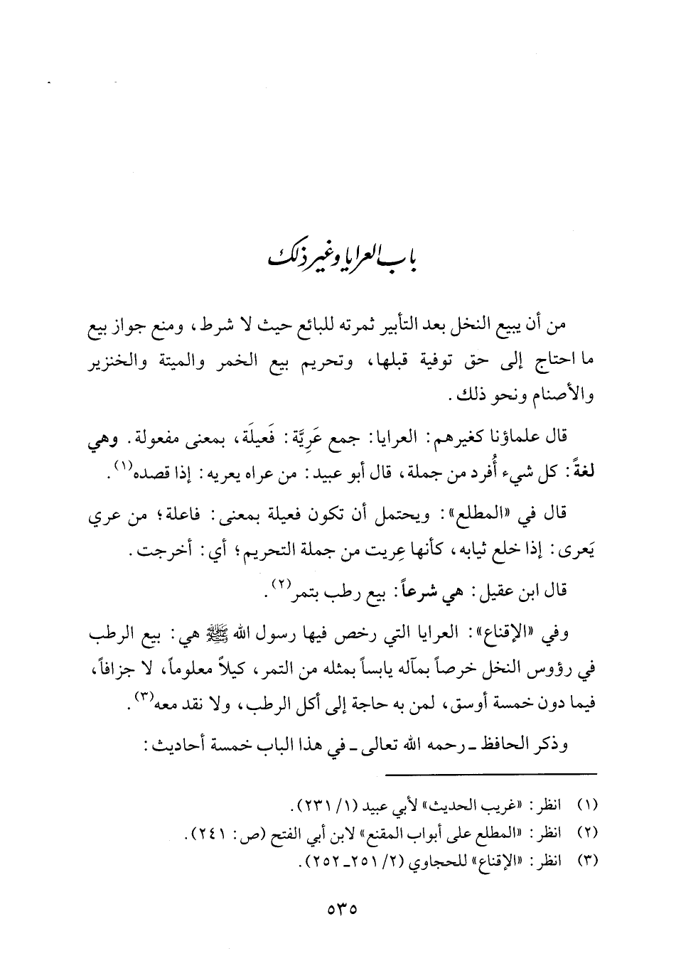 وفي "الإقناع": العرايا التي رخص فيها رسول الله - صلى الله عليه وسلم - هي: بيع الرطب في رؤوس النخل خرصًا بمآله يابسًا بمثله من التمر، كيلًا معلومًا، لا جزافًا، فيما دون خمسة أوسق، لمن به حاجة إلى أكل الرطب، ولا نقد معه (٣).