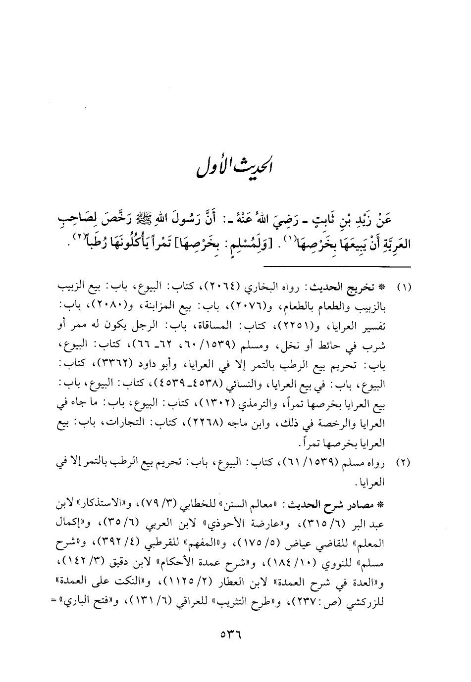 رواه البخاري (٢٠٦٤)، كتاب: البيوع، باب: بيع الزبيب بالزبيب والطعام بالطعام، و (٢٠٧٦)، باب: بيع المزابنة، و (٢٠٨٠)، باب: تفسير العرايا، و (٢٢٥١)، كتاب: المساقاة، باب: الرجل يكون له ممر أو شرب في حائط أو نخل، ومسلم (١٥٣٩/ ٦٠، ٦٢ - ٦٦)، كتاب: البيوع، باب: تحريم بيع الرطب بالتمر إلا في العرايا، وأبو داود (٣٣٦٢)، كتاب: البيوع، باب: في بيع العرايا، والنسائي (٤٥٣٨ - ٤٥٣٩)، كتاب: البيوع، باب: بيع العرايا بخرصها تمرًا، والترمذي (١٣٠٢)، كتاب: البيوع، باب: ما جاء في العرايا والرخصة في ذلك، وابن ماجه (٢٢٦٨)، كتاب: التجارات، باب: بيع العرايا بخرصها تمرًا.