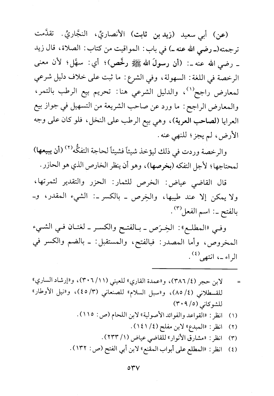 (عن) أبي سعيد (زيد بن ثابت) الأنصاريِّ، النجَّاريِّ. تقدَّمت ترجمته (- رضي الله عنه -) في باب: المواقيت من كتاب: الصلاة، قال زيد - رضي الله عنه -: (أن رسولَ الله - صلى الله عليه وسلم - رخَّص)؛ أي: سهَّل؛ لأن معنى الرخصة في اللغة: السهولة، وفي الشرع: ما ثبت على خلاف دليل شرعي لمعارض راجح (١)، والدليل الشرعي هنا: تحريم بيع الرطب بالتمر، والمعارض الراجح: ما ورد عن صاحب الشريعة من التسهيل في جواز بيع العرايا (لصاحب العرية)، وهي بيع الرطب على النخل، فلو كان على وجه الأرض، لم يجز؛ للنهي عنه.