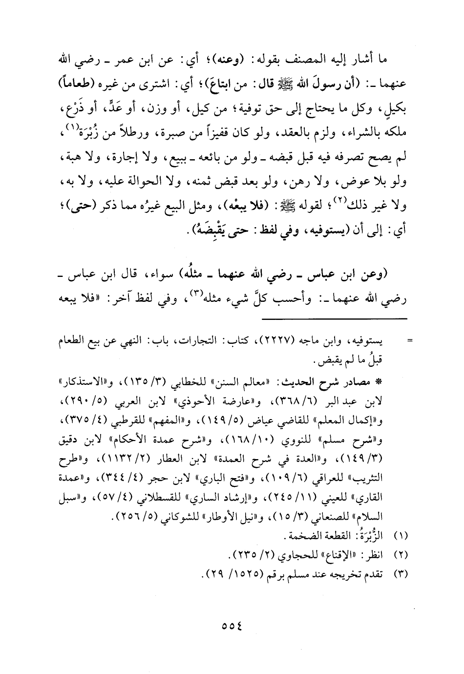 ما أشار إليه المصنف بقوله: (وعنه)؛ أي: عن ابن عمر - رضي الله عنهما -: (أن رسولَ الله - صلى الله عليه وسلم - قال: من ابتاعَ)؛ أي: اشترى من غيره (طعامًا) بكيلٍ، وكل ما يحتاج إلى حق توفية، من كيل، أو وزن، أو عَدٍّ، أو ذَرْع، ملكه بالشراء، ولزم بالعقد، ولو كان قفيزًا من صبرة، ورطلًا من زُبْرَة (١)، لم يصح تصرفه فيه قبل قبضه -ولو من بائعه- ببيع، ولا إجارة، ولا هبة، ولو بلا عوض، ولا رهن، ولو بعد قبض ثمنه، ولا الحوالة عليه، ولا به، ولا غير ذلك (٢)، لقوله - صلى الله عليه وسلم -: (فلا يبعْه)، ومثل البيع غيرُه مما ذكر (حتى)؛ أي: إلى أن (يستوفيه، وفي لفظ: حتى يَقْبِضَهُ).