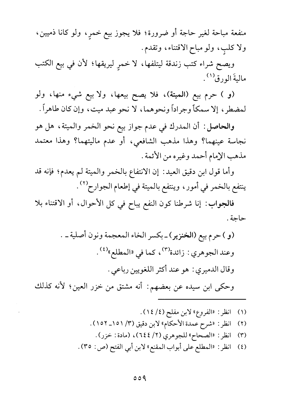 وأما قول ابن دقيق العيد: إن الانتفاع بالخمر والميتة لم يعدم، فإنه قد ينتفع بالخمر في أمور، وينتفع بالميتة في إطعام الجوارح (٢).
