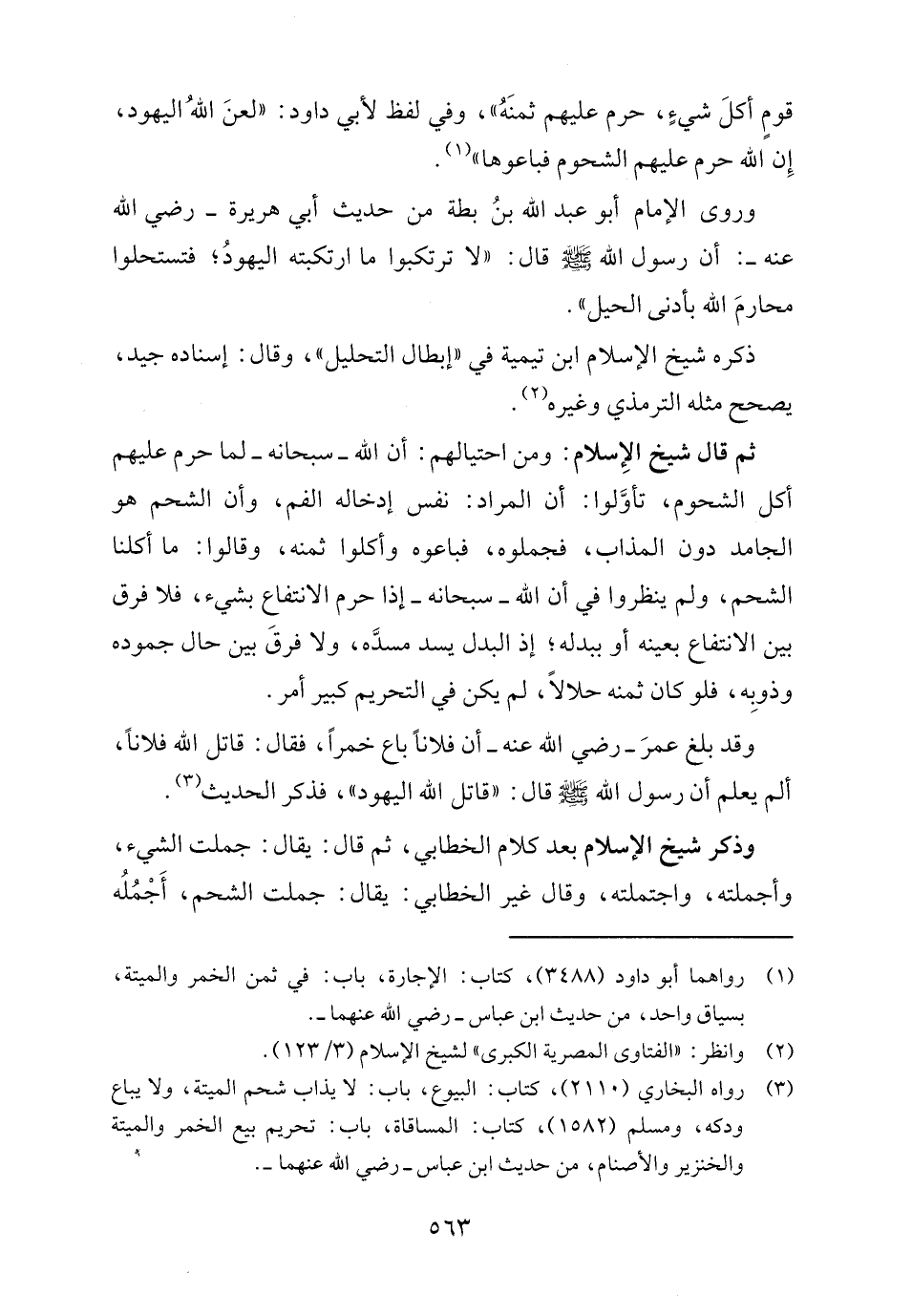 قومٍ أكلَ شيءٍ، حرم عليهم ثمنَهُ"، وفي لفظ لأبي داود: "لعنَ اللهُ اليهود، إِن الله حرم عليهم الشحوم فباعوها" (١).