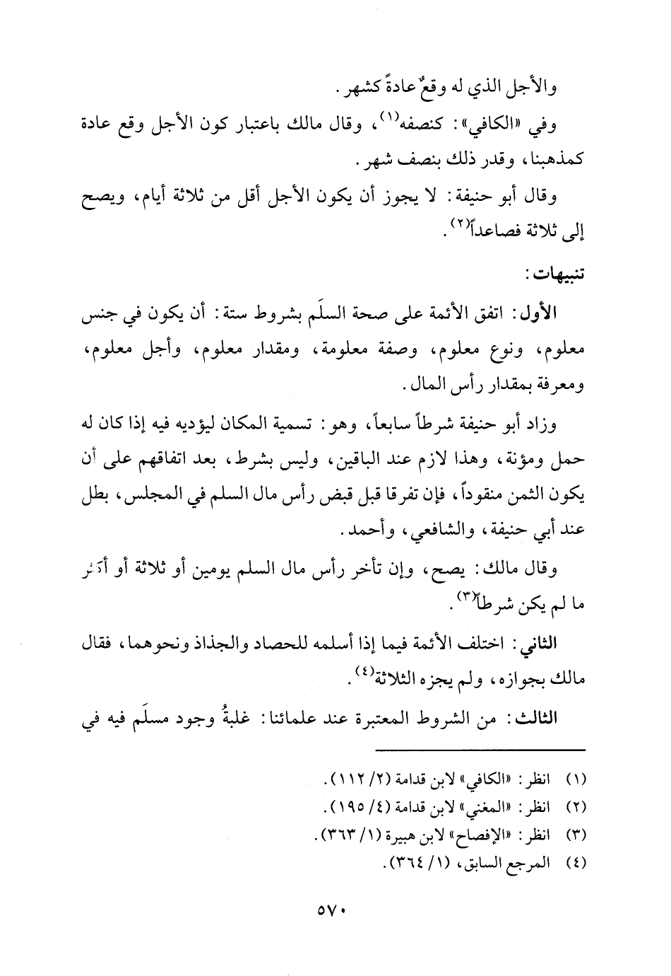الأول: اتفق الأئمة على صحة السلَم بشروط ستة: أن يكون في جنس معلوم، ونوع معلوم، وصفة معلومة، ومقدار معلوم، وأجل معلوم، ومعرفة بمقدار رأس المال.