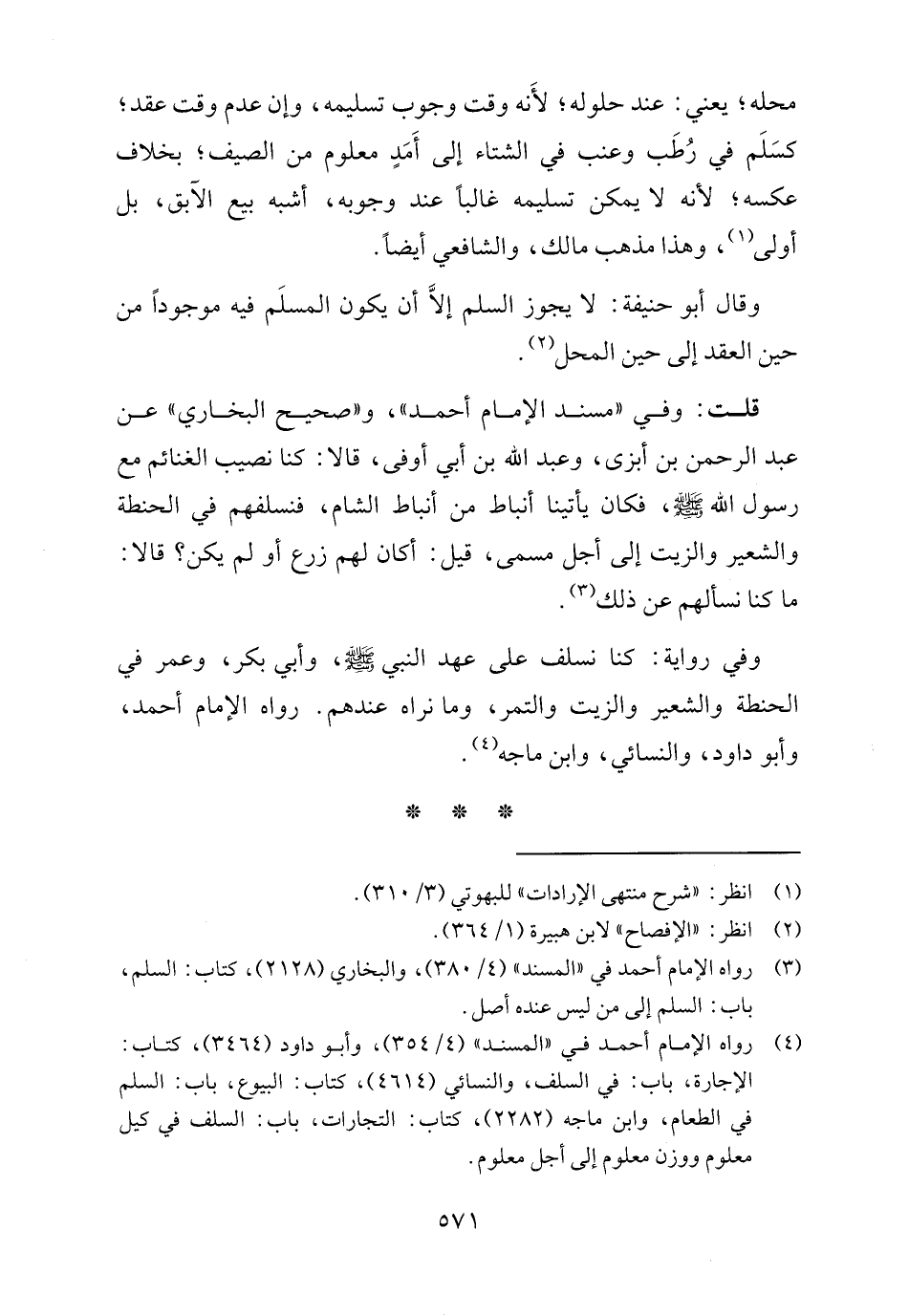 وفي رواية: كنا نسلف على عهد النبي - صلى الله عليه وسلم -، وأبي بكر، وعمر في الحنطة والشعير والزيت والتمر، وما نراه عندهم. رواه الإمام أحمد، وأبو داود، والنسائي، وابن ماجه (٤).