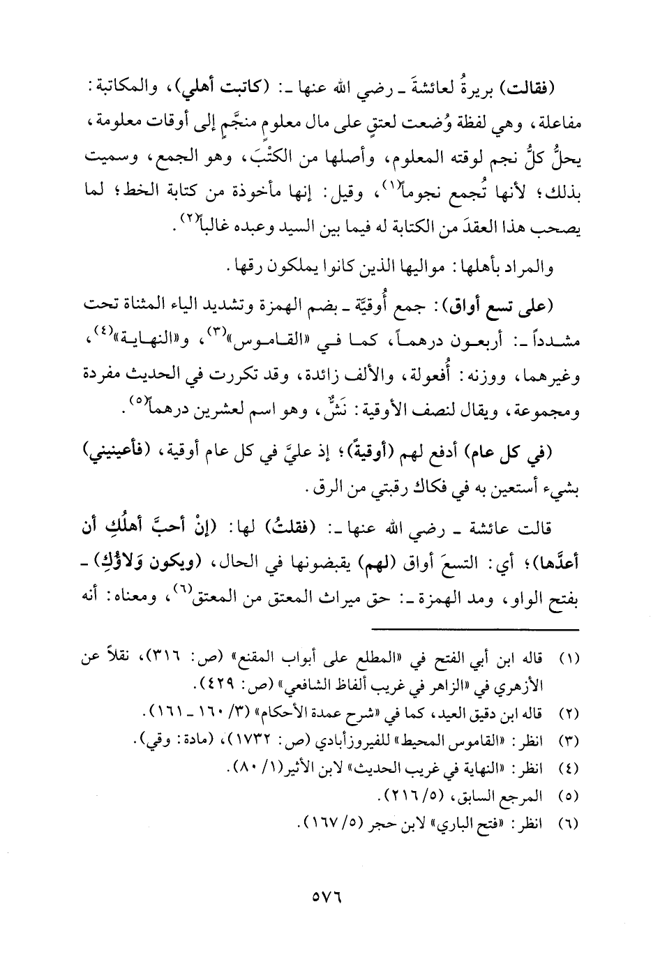 قالت عائشة - رضي الله عنها -: (فقلتُ) لها: (إنْ أحبَّ أهلُكِ أن أعدَّها)، أي: التسعَ أواق (لهم) يقبضونها في الحال، (ويكون وَلاؤُكِ) -بفتح الواو، ومد الهمزة-: حق ميراث المعتق من المعتق (٦)، ومعناه: أنه