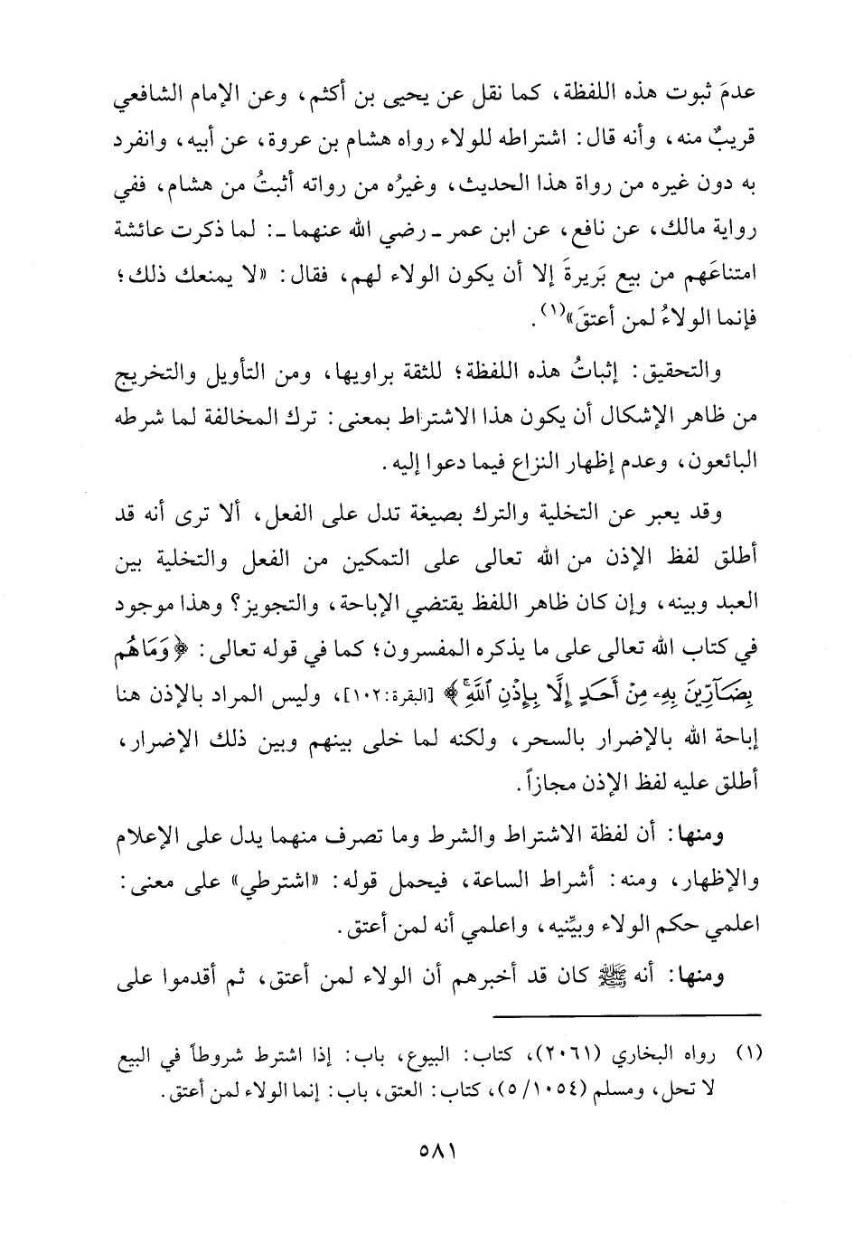 والتحقيق: إثباتُ هذه اللفظة، للثقة براويها، ومن التأويل والتخريج من ظاهر الإشكال أن يكون هذا الاشتراط بمعنى: ترك المخالفة لما شرطه البائعون، وعدم إظهار النزاع فيما دعوا إليه.