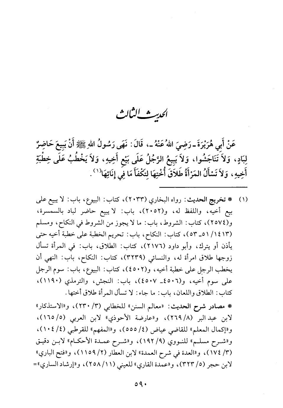 عَنْ أَبِي هُرَيْرَةَ - رَضِيَ اللهُ عَنْهُ -، قَالَ: نَهى رَسُولُ اللهِ - صلى الله عليه وسلم - أَنْ يَبِيعَ حَاضِرٌ لِبَادٍ، وَلاَ تَنَاجَشُوا، وَلاَ يَبِيعُ الرَّجُلُ عَلَى بَيع أَخِيهِ، وَلاَ يَخْطُبُ عَلَى خِطْبةِ أَخِيهِ، وَلاَ تَسْأَلُ المَرأَةُ طَلاَقَ أُخْتِها لِتَكْفَأَ مَا فِي إنَائِها (١).
