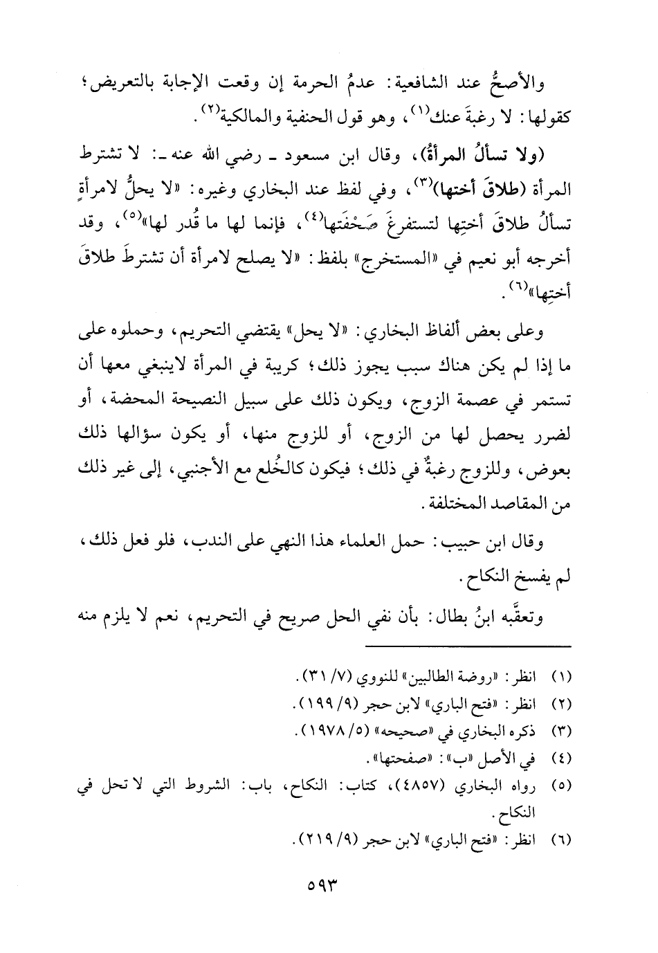 (ولا تسألُ المرأةُ)، وقال ابن مسعود - رضي الله عنه -: لا تشترط المرأة (طلاقَ أختها) (٣)، وفي لفظ عند البخاري وغيره: "لا يحلُّ لامرأةٍ تسألُ طلاقَ أختِها لتستفرغَ صَحْفَتها (٤)، فإنما لها ما قُدر لها" (٥)، وقد أخرجه أبو نعيم في "المستخرج" بلفظ: "لا يصلح لامرأة أن تشترطَ طلاقَ أختِها" (٦).