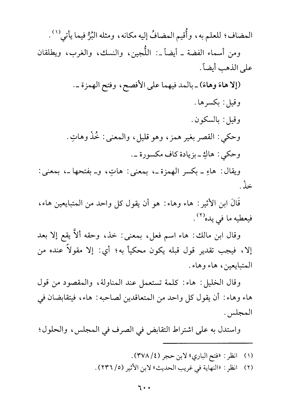 وقال الخليل: هاء: كلمة تستعمل عند المناولة، والمقصود من قول هاء وهاء: أن يقول كل واحد من المتعاقدين لصاحبه: هاء، فيتقابضان في المجلس.