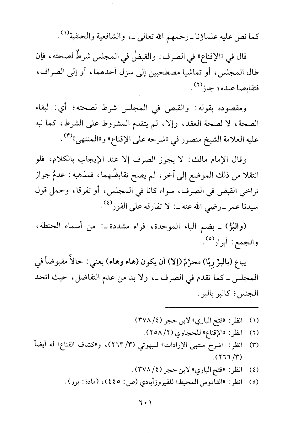 ومقصوده بقوله: والقبض في المجلس شرط لصحته، أي: لبقاء الصحة، لا لصحة العقد، وإلا، لم يتقدم المشروط على الشرط، كما نبه عليه العلامة الشيخ منصور في "شرحه على الإقناع" و"المنتهى" (٣).