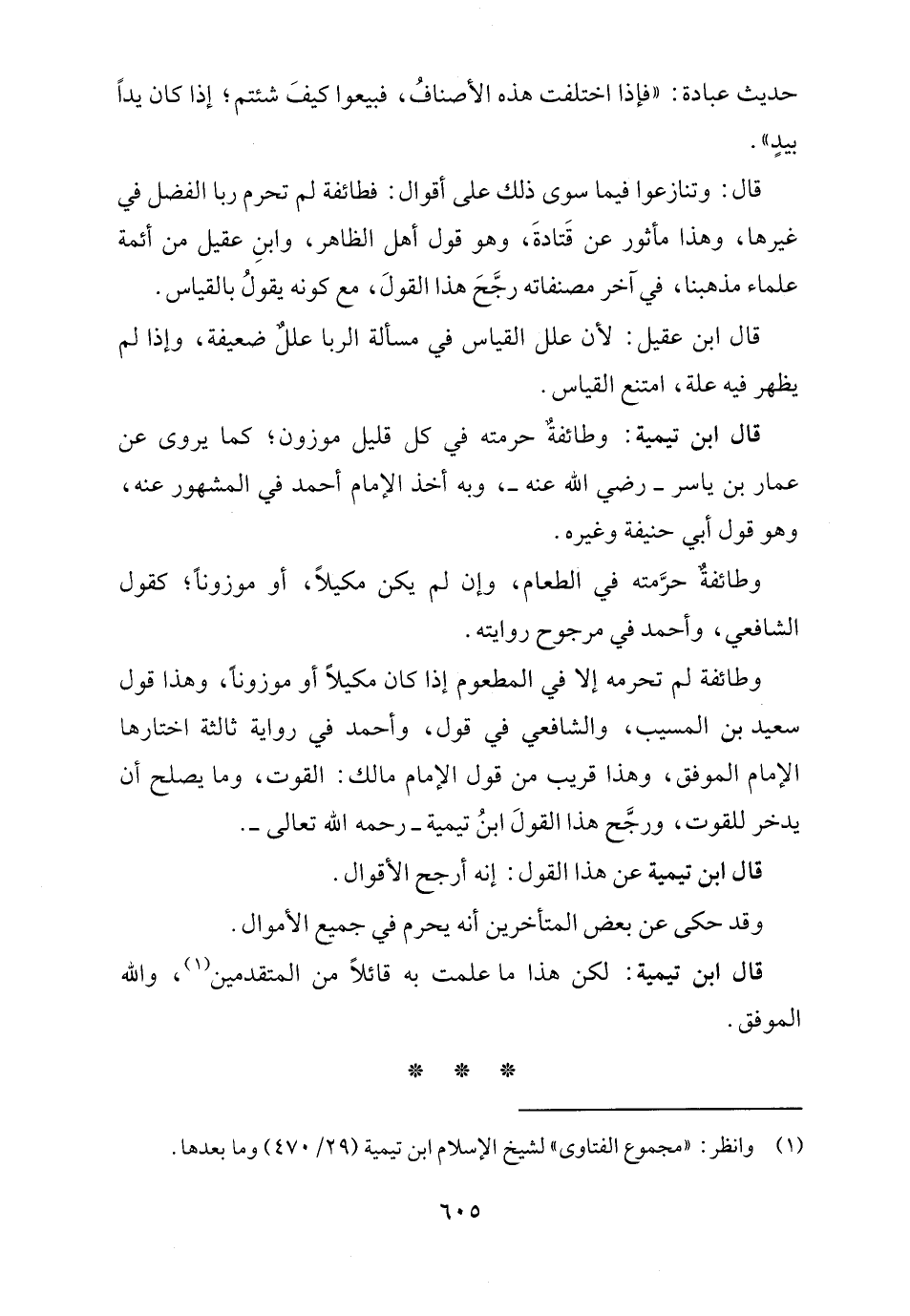 قال: وتنازعوا فيما سوى ذلك على أقوال: فطائفة لم تحرم ربا الفضل في غيرها، وهذا مأثور عن قَتادةَ، وهو قول أهل الظاهر، وابنِ عقيل من أئمة علماء مذهبنا، في آخر مصنفاته رجَّحَ هذا القولَ، مع كونه يقولُ بالقياس.