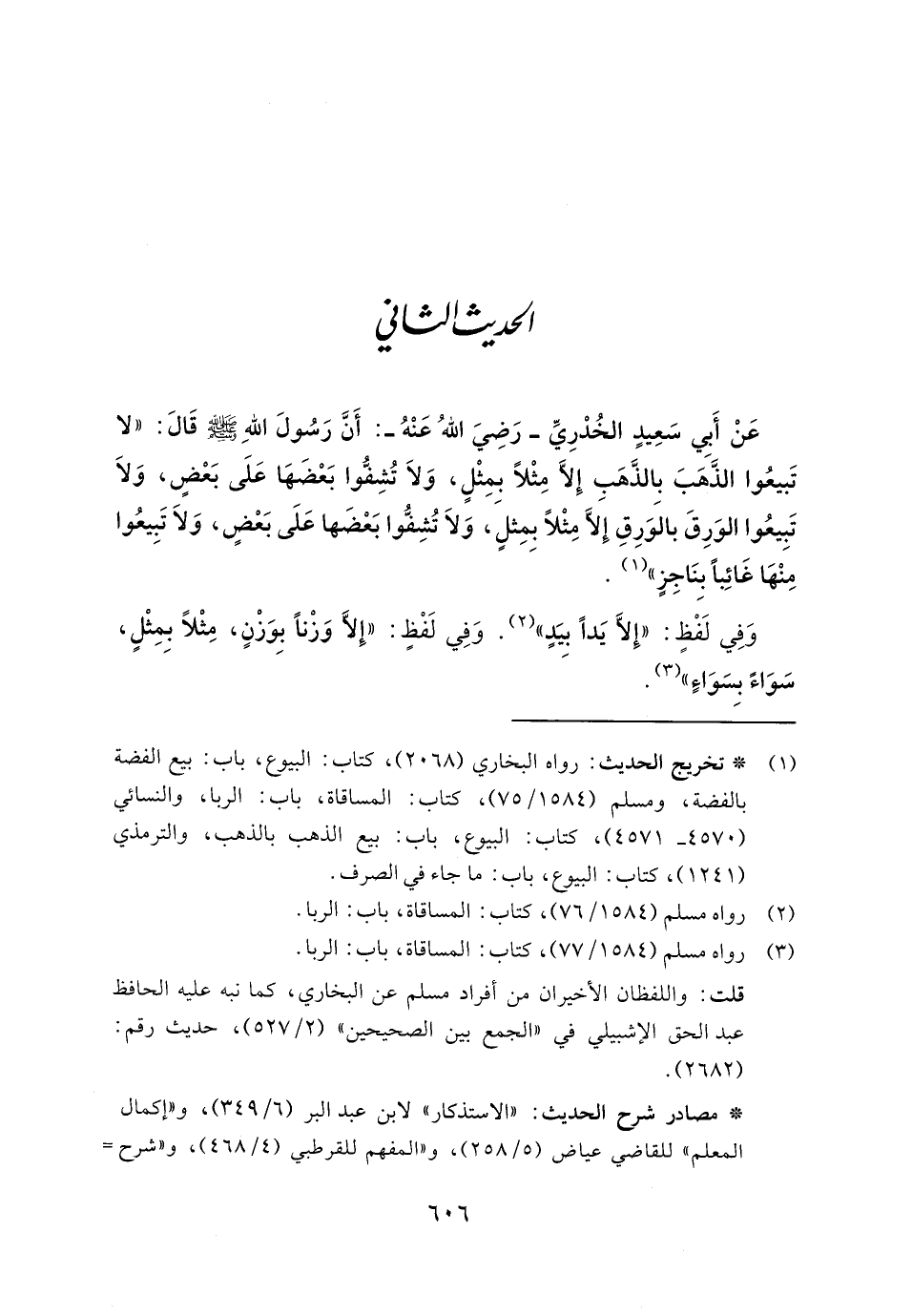 عَنْ أَبِي سَعِيدٍ الخُدرِيِّ - رَضِيَ اللهُ عَنْهُ -: أَنَّ رَسُولَ اللهِ - صلى الله عليه وسلم - قالَ: "لا تَبيعُوا الذَّهبَ بِالذَّهبِ إِلَّا مِثْلًا بمِثْلٍ، وَلاَ تُشِفُّوا بَعضَها عَلَى بَعضٍ، وَلاَ تَبِيعُوا الوَرِقَ بالَوَرِقِ إَلَّا مِثْلًا بِمِثلٍ، وَلاَ تُشِفُّوا بَعضَها عَلَى بعضٍ، وَلاَ تَبِيعُوا مِنْها غَائِبًا بِنَاجِزٍ" (١).