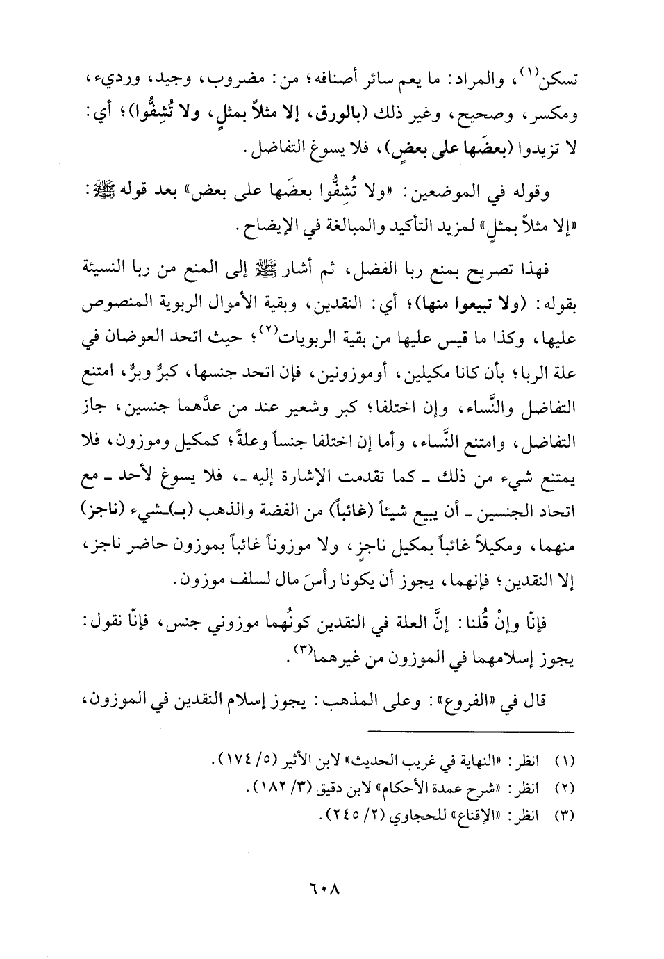 فهذا تصريح بمنع ربا الفضل، ثم أشار - صلى الله عليه وسلم - إلى المنع من ربا النسيئة بقوله: (ولا تبيعوا منها)، أي: النقدين، وبقية الأموال الربوية المنصوص عليها، وكذا ما قيس عليها من بقية الربويات (٢)، حيث اتحد العوضان في علة الربا، بأن كانا مكيلين، أو موزونين، فإن اتحد جنسها، كبرٍّ وبرٍّ، امتنع التفاضل والنَّساء، وإن اختلفا، كبر وشعير عند من عدَّهما جنسين، جاز التفاضل، وامتنع النَّساء، وأما إن اختلفا جنسًا وعلةً، كمكيل وموزون، فلا يمتنع شيء من ذلك -كما تقدمت الإشارة إليه-، فلا يسوغ لأحد -مع اتحاد الجنسين- أن يبيع شيئًا (غائبًا) من الفضة والذهب (بـ) ـشيء (ناجز) منهما، ومكيلًا غائبا بمكيل ناجزٍ، ولا موزونًا غائبًا بموزون حاضر ناجز، إلا النقدين، فإنهما، يجوز أن يكونا رأسَ مال لسلف موزون.