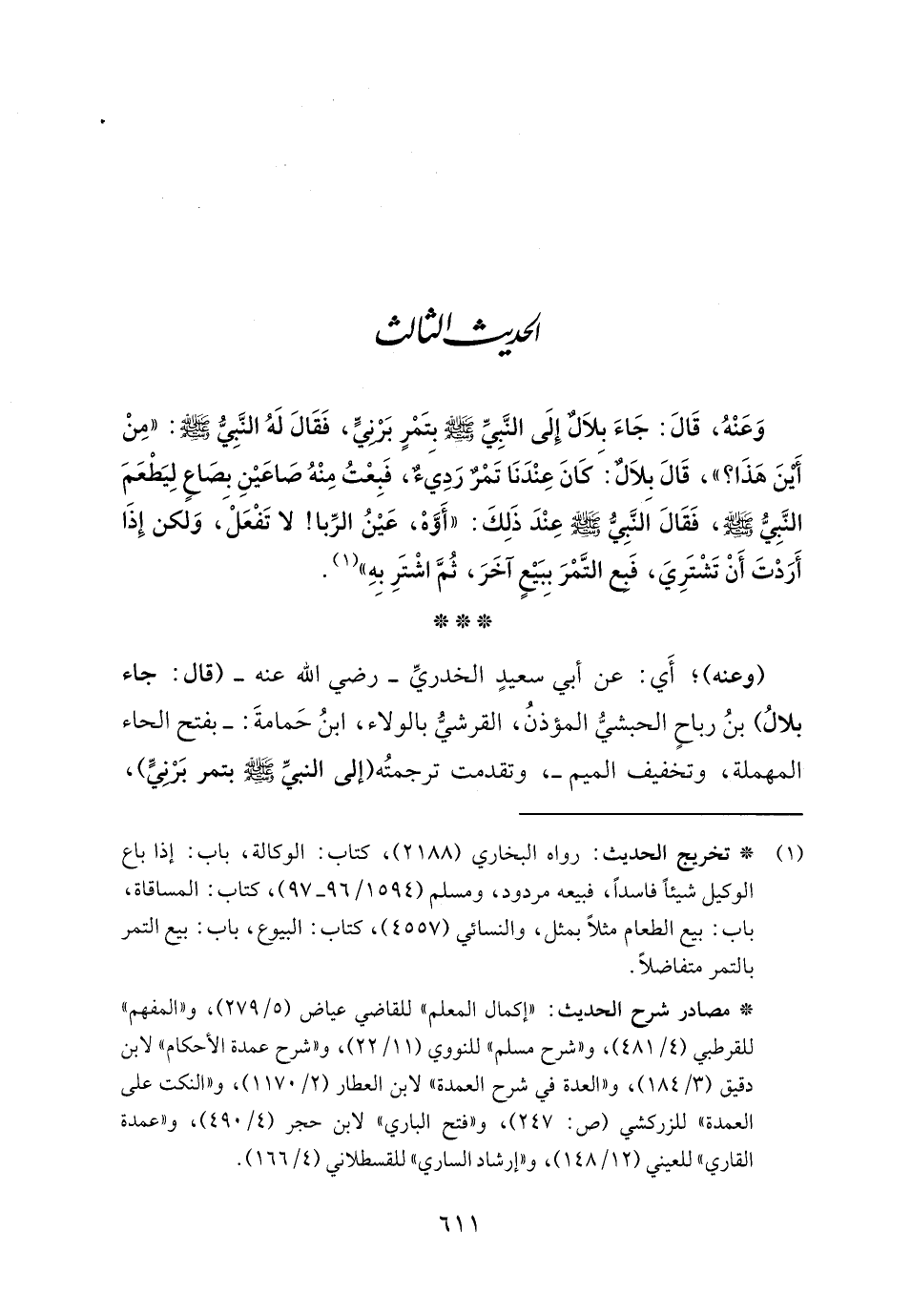 وَعَنْهُ، قَالَ: جَاءَ بلالٌ إِلَى النَّبِيِّ - صلى الله عليه وسلم - بِتَمرٍ بَرْنِيٍّ، فَقَالَ لَهُ النَّبِيُّ - صلى الله عليه وسلم -: "مِنْ أَيْنَ هذَا؟ "، قَالَ بلاَلٌ: كانَ عِنْدَنَا تَمرٌ رَدِيءٌ، فَبِغتُ مِنْهُ صَاعَيْنِ بصَاعٍ لِيَطْعَمَ النَّبِيُّ - صلى الله عليه وسلم -، فَقَالَ النَّبِيُّ - صلى الله عليه وسلم - عنْدَ ذَلِكَ: "أَوَّهْ، عَيْنُ الرِّبا! لا تَفْعَل، وَلكن إِذَا أَرَدتَ أَنْ تَشْتَرِيَ، فَبع التمرَ بِبَيْعٍ آخَرَ، ثُمَّ اشْتَرِ بِهِ" (١).