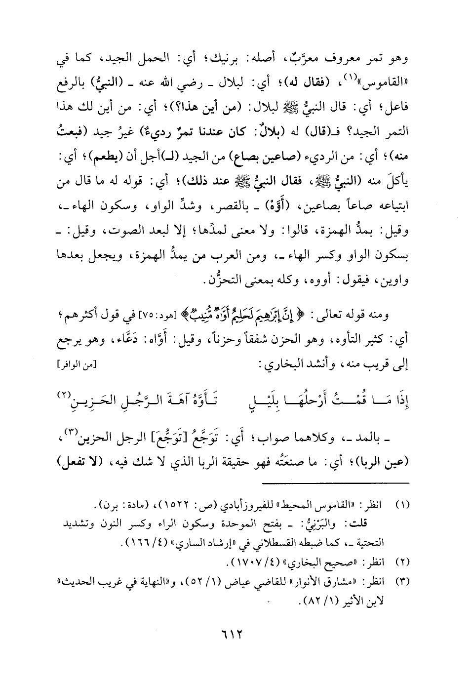 ومنه قوله تعالى: {إِنَّ إِبْرَاهِيمَ لَحَلِيمٌ أَوَّاهٌ مُنِيبٌ (٧٥)} [هود: ٧٥] في قول أكثرهم؛ أي: كثير التأوه، وهو الحزن شفقًا وحزنًا، وقيل: أَوَّاه: دَعَّاء، وهو يرجع إلى قريب منه، وأنشد البخاري: [من الوافر]