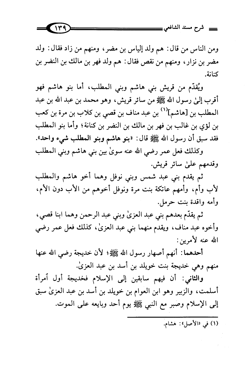 ويُقدّم من قريش بني هاشم وبني المطلب، أما بنو هاشم فهو أقرب إلى رسول الله - صلى الله عليه وسلم - من سائر قريش، وهو محمَّد بن عبد الله بن عبد المطلب بن [هاشم] (¬1) بن عبد مناف بن قصي بن كلاب بن مرة بن كعب بن لؤي بن غالب بن فهر بن مالك بن النضر بن كنانة؛ وأما بنو المطلب فقد سبق أن رسول الله - صلى الله عليه وسلم - قال: "بنو هاشم وبنو المطلب شيء واحد".