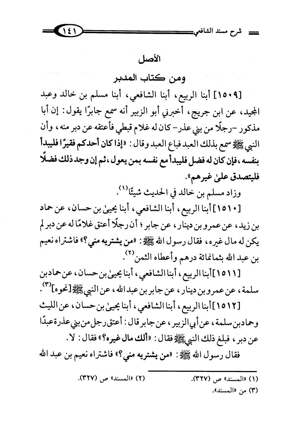 [1510] أبنا الربيع، أبنا الشافعي، أبنا يحيى بن حسان، عن حماد بن زيد، عن عمرو بن دينار، عن جابر؛ أن رجلًا أعتق غلامًا له عن دبر لم يكن له مال غيره، فقال رسول الله - صلى الله عليه وسلم -: "من يشتريه مني؟ " فاشتراه نعيم بن عبد الله بثمانمائة درهم وأعطاه الثمن (¬2).