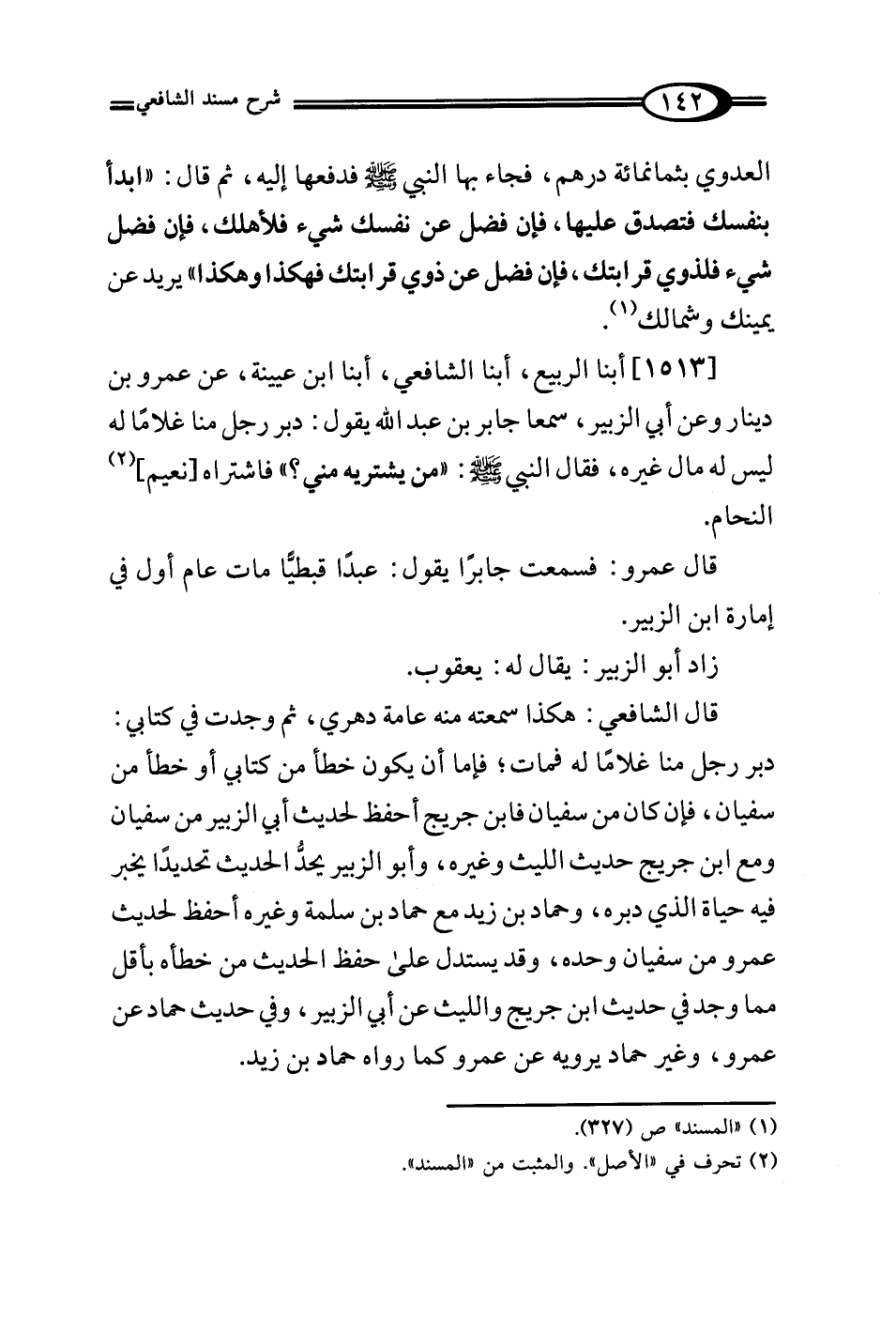 [1513] أبنا الربيع، أبنا الشافعي، أبنا ابن عيينة، عن عمرو بن دينار وعن أبي الزبير، سمعا جابر بن عبد الله يقول: دبر رجل منا غلامًا له ليس له مال غيره، فقال النبي - صلى الله عليه وسلم -: "من يشتريه مني؟ " فاشتراه [نعيم] (¬2) النحام.