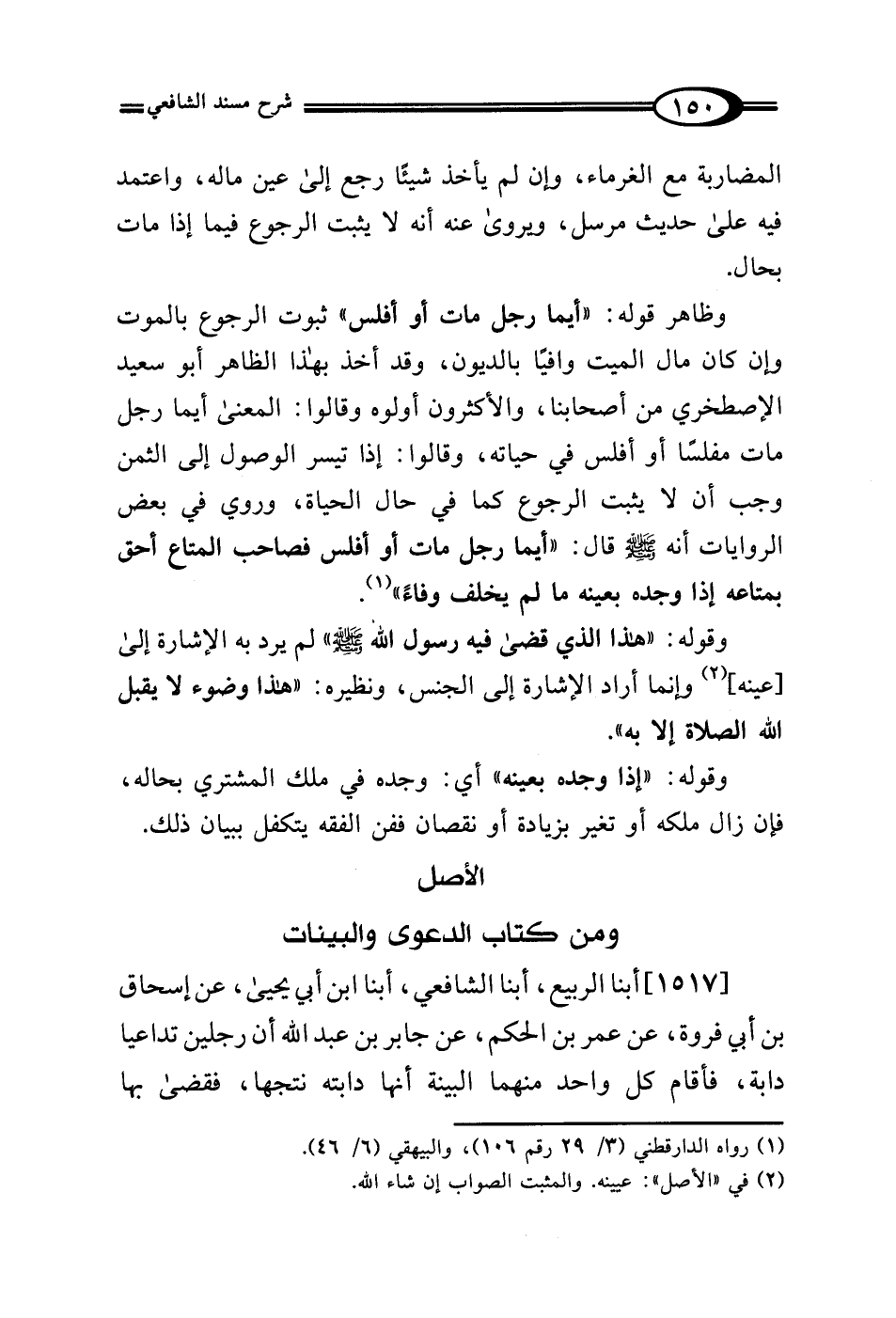 [1517] أبنا الربيع، أبنا الشافعي، أبنا ابن أبي يحيى، عن إسحاق بن أبي فروة، عن عمر بن الحكم، عن جابر بن عبد الله أن رجلين تداعيا دابة، فأقام كل واحد منهما البينة أنها دابته نتجها، فقضى بها