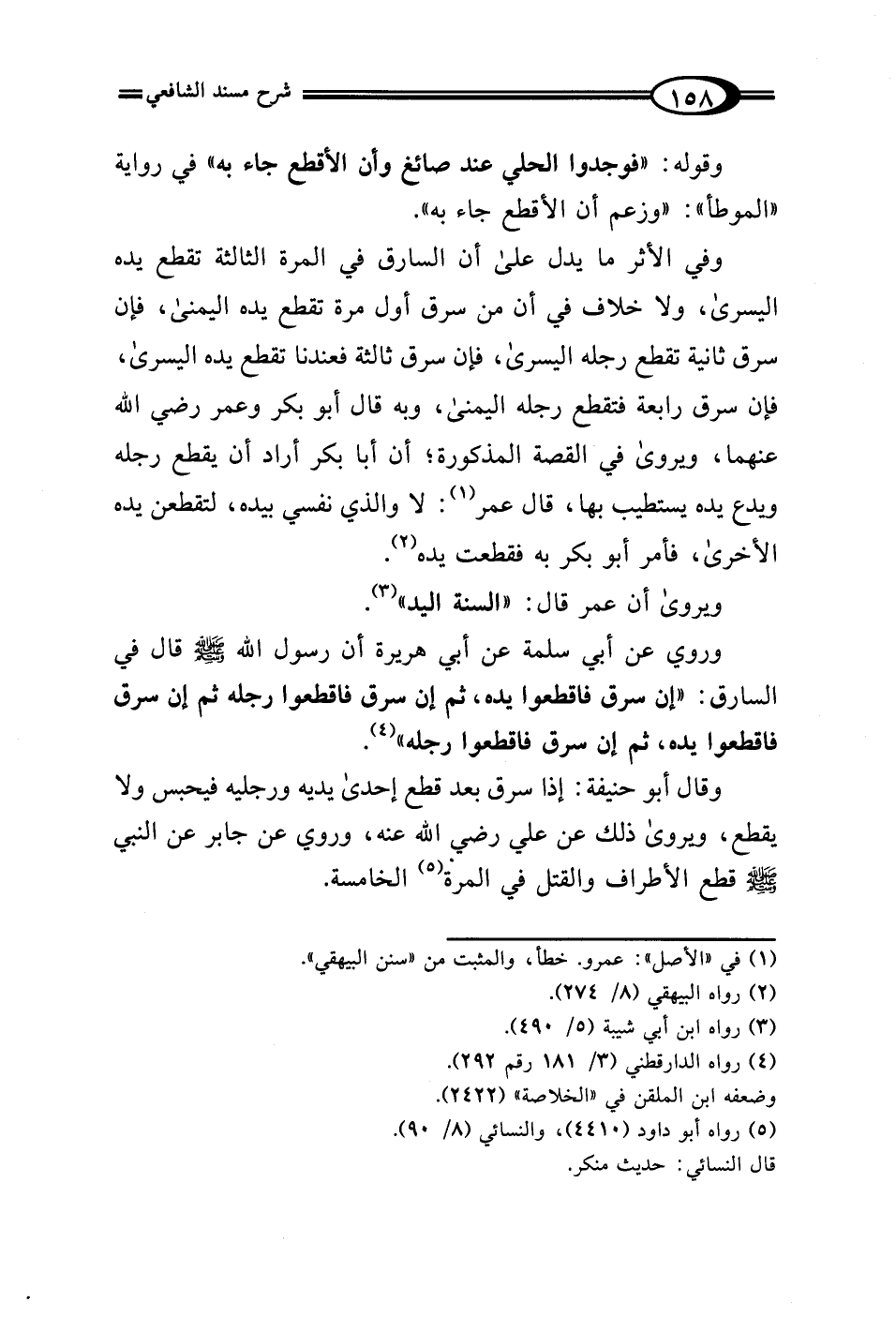 وفي الأثر ما يدل على أن السارق في المرة الثالثة تقطع يده اليسرى، ولا خلاف في أن من سرق أول مرة تقطع يده اليمنى، فإن سرق ثانية تقطع رجله اليسرى، فإن سرق ثالثة فعندنا تقطع يده اليسرى، فإن سرق رابعة فتقطع رجله اليمنى، وبه قال أبو بكر وعمر رضي الله عنهما، ويروى في القصة المذكورة؛ أن أبا بكر أراد أن يقطع رجله ويدع يده يستطيب بها، قال عمر (¬1): لا والذي نفسي بيده، لتقطعن يده الأخرى، فأمر أبو بكر به فقطعت يده (¬2).