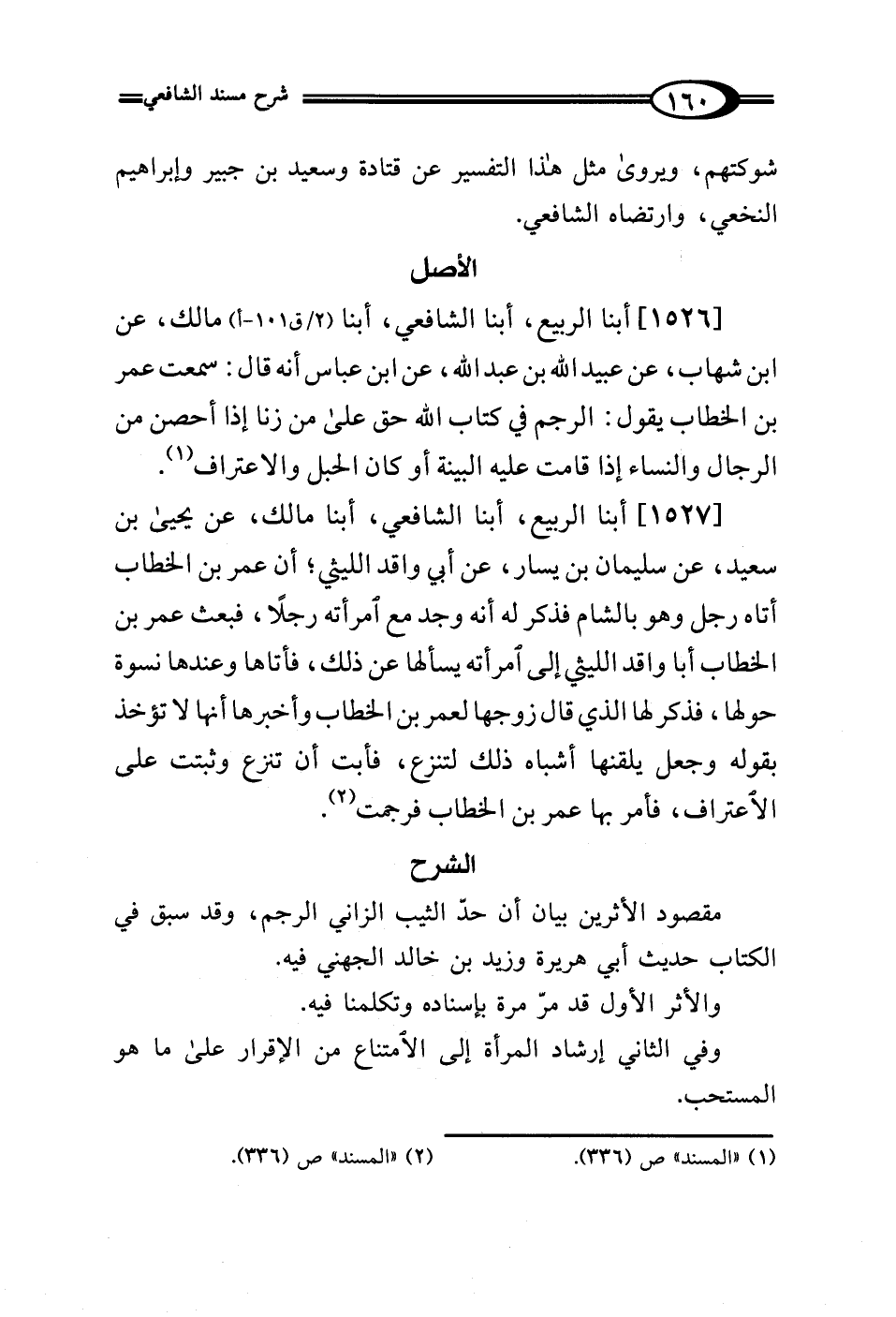 [1526] أبنا الربيع، أبنا الشافعي، أبنا مالك، عن ابن شهاب، عن عبيد الله بن عبد الله، عن ابن عباس أنه قال: سمعت عمر بن الخطاب يقول: الرجم في كتاب الله حق على من زنا إذا أحصن من الرجال والنساء إذا قامت عليه البينة أو كان الحبل والاعتراف (¬1).