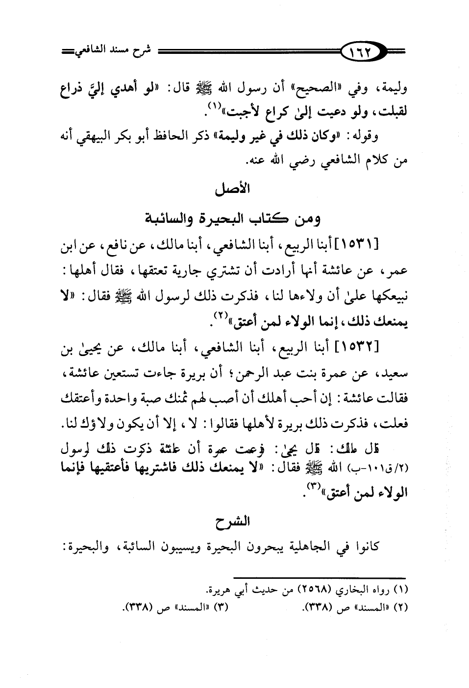 [1532] أبنا الربيع، أبنا الشافعي، أبنا مالك، عن يحيى بن سعيد، عن عمرة بنت عبد الرحمن؛ أن بريرة جاءت تستعين عائشة، فقالت عائشة: إن أحب أهلك أن أصب لهم ثمنك صبة واحدة وأعتقك فعلت، فذكرت ذلك بريرة لأهلها فقالوا: لا، إلا أن يكون ولاؤك لنا.