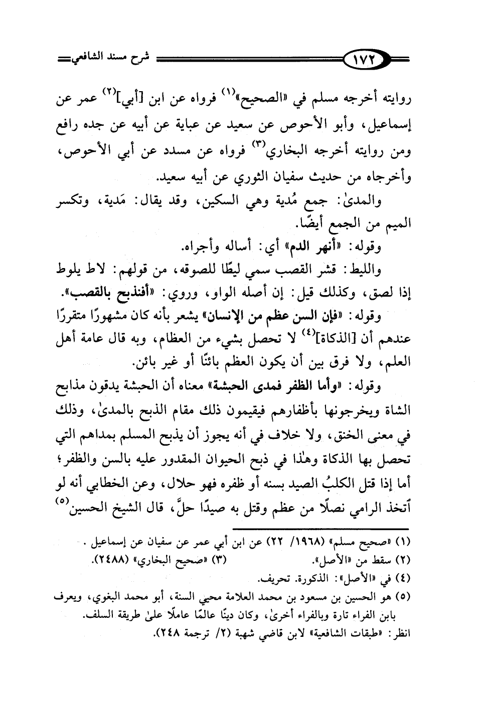 وقوله: "وأما الظفر فمدى الحبشة" معناه أن الحبشة يدقون مذابح الشاة ويخرجونها بأظفارهم فيقيمون ذلك مقام الذبح بالمدى، وذلك في معنى الخنق، ولا خلاف في أنه يجوز أن يذبح المسلم بمداهم التي تحصل بها الذكاة وهذا في ذبح الحيوان المقدور عليه بالسن والظفر؛ أما إذا قتل الكلبُ الصيد بسنه أو ظفره فهو حلال، وعن الخطابي أنه لو اتخذ الرامي نصلًا من عظم وقتل به صيدًا حلَّ، قال الشيخ الحسين (¬5)