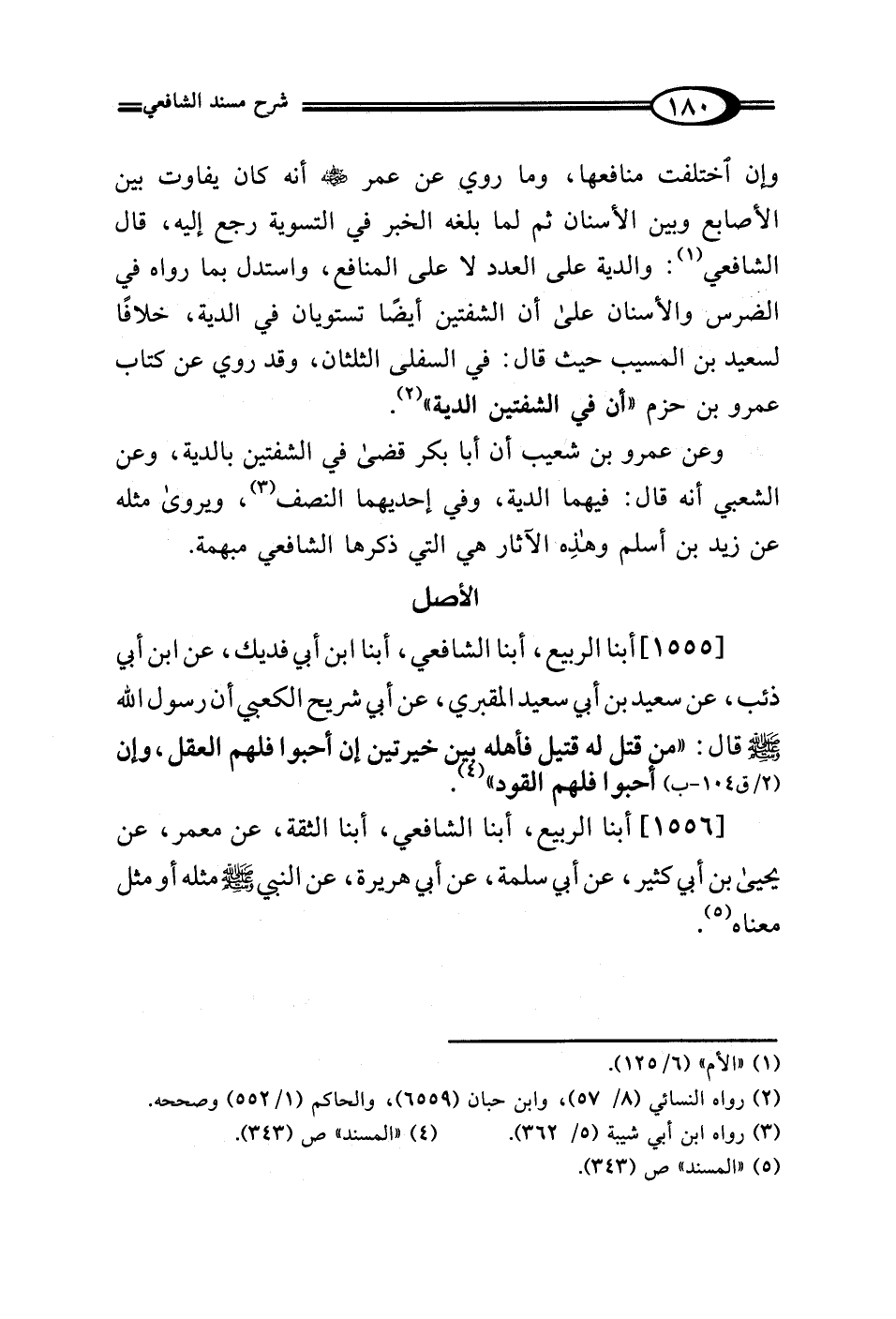 [1555] أبنا الربيع، أبنا الشافعي، أبنا ابن أبي فديك، عن ابن أبي ذئب، عن سعيد بن أبي سعيد المقبري، عن أبي شريح الكعبي أن رسول الله - صلى الله عليه وسلم - قال: "من قتل له قتيل فأهله بين خيرتين إن أحبوا فلهم العقل، وإن أحبوا فلهم القود" (¬4).