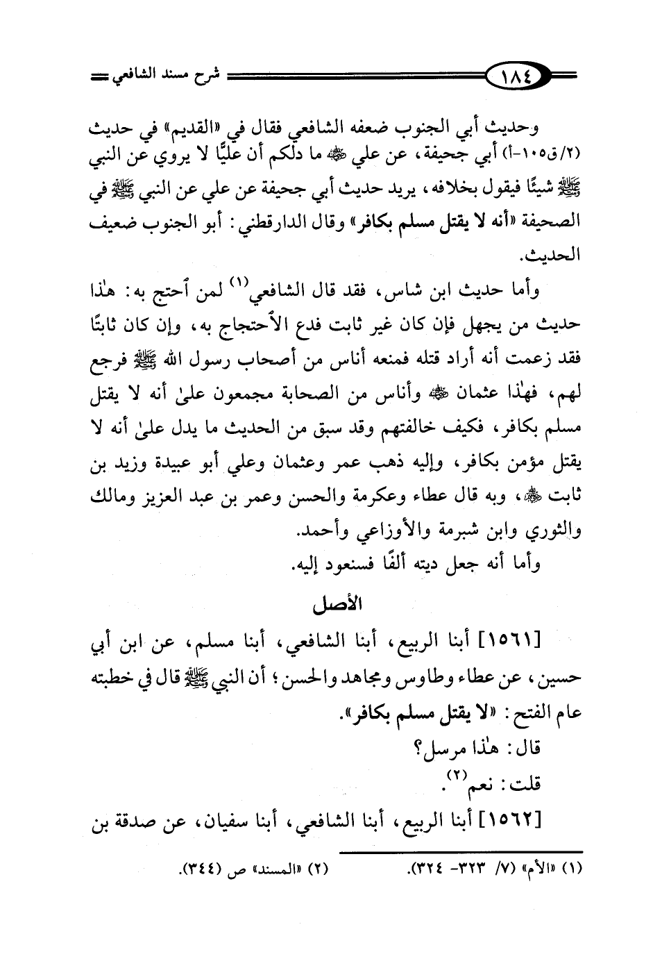 [1561] أبنا الربيع، أبنا الشافعي، أبنا مسلم، عن ابن أبي حسين، عن عطاء وطاوس ومجاهد والحسن؛ أن النبي - صلى الله عليه وسلم - قال في خطبته عام الفتح: "لا يقتل مسلم بكافر".