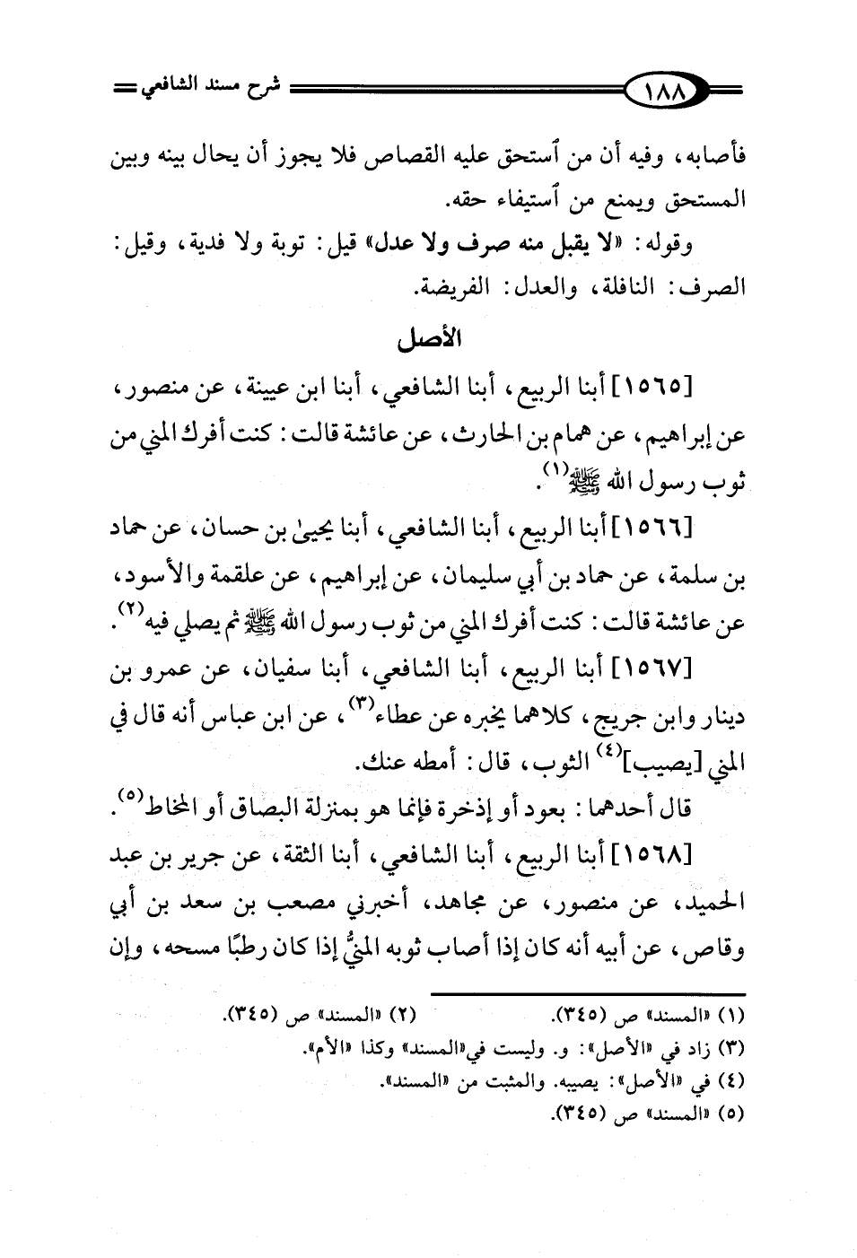 [1565] أبنا الربيع، أبنا الشافعي، أبنا ابن عيينة، عن منصور، عن إبراهيم، عن همام بن الحارث، عن عائشة قالت: كنت أفرك المني من ثوب رسول الله - صلى الله عليه وسلم - (¬1).