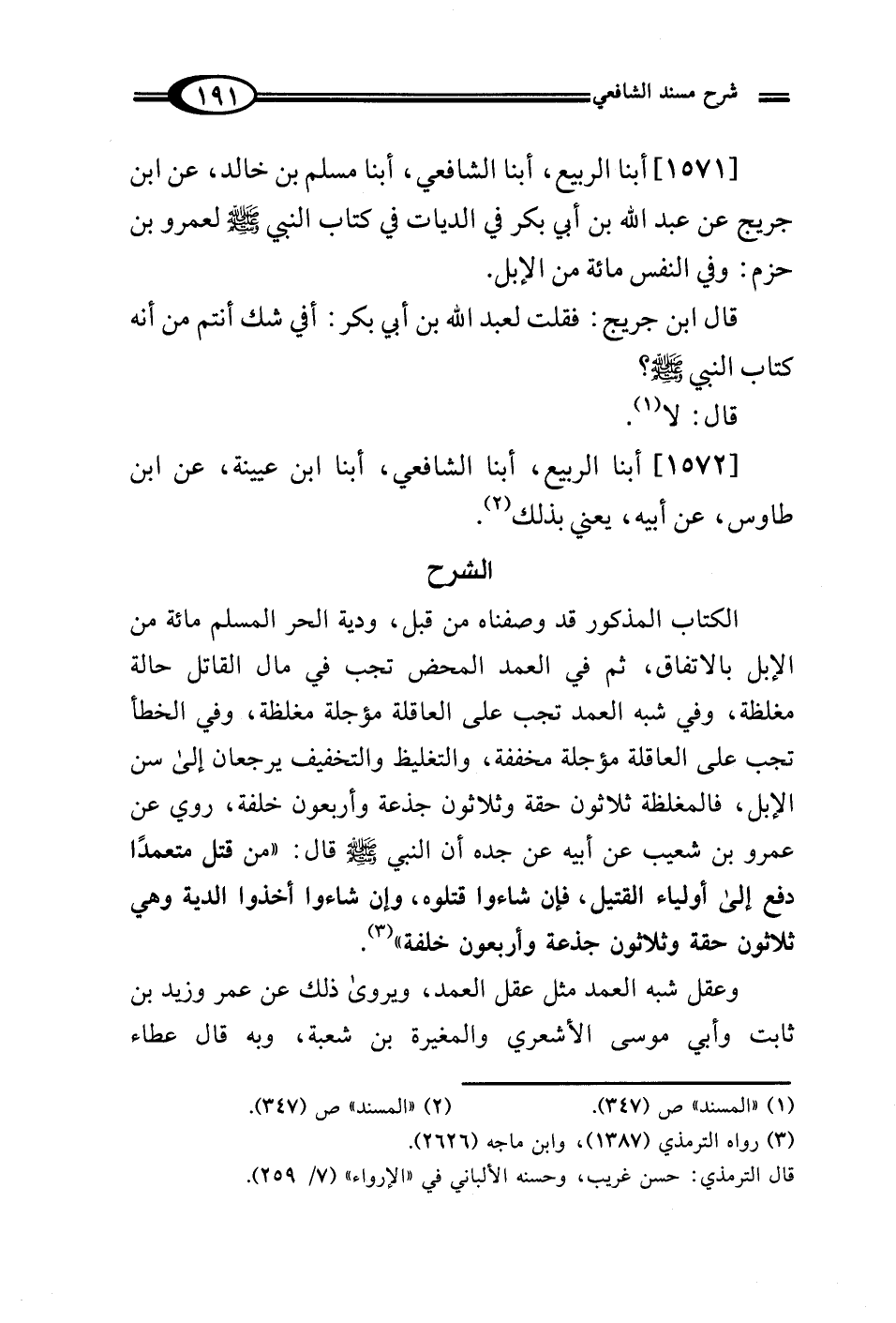 [1571] أبنا الربيع، أبنا الشافعي، أبنا مسلم بن خالد، عن ابن جريج عن عبد الله بن أبي بكر في الديات في كتاب النبي - صلى الله عليه وسلم - لعمرو بن حزم: وفي النفس مائة من الإبل.