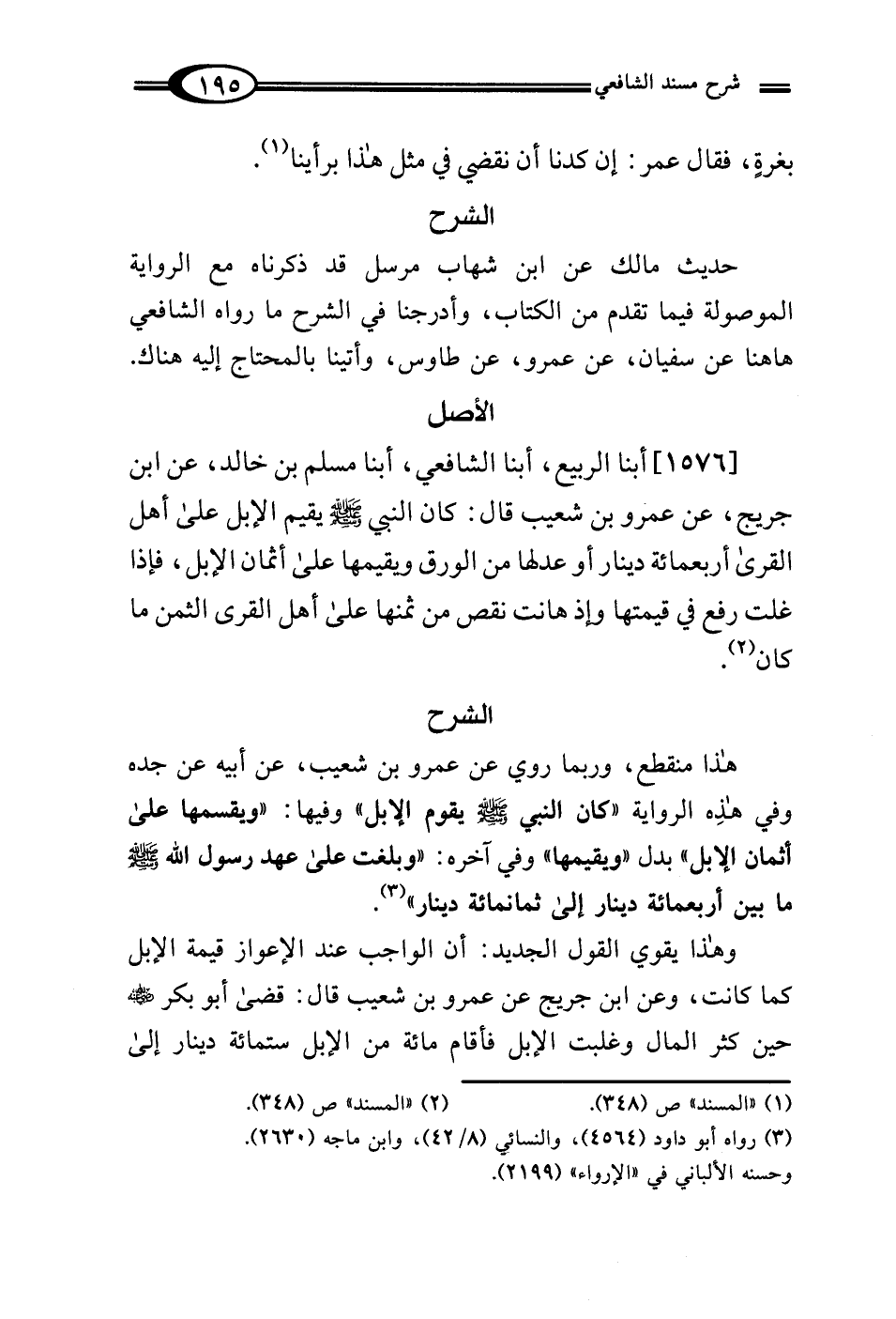 [1576] أبنا الربيع، أبنا الشافعي، أبنا مسلم بن خالد، عن ابن جريج، عن عمرو بن شعيب قال: كان النبي - صلى الله عليه وسلم - يقيم الإبل على أهل القرى أربعمائة دينار أو عدلها من الورق ويقيمها على أثمان الإبل، فإذا غلت رفع في قيمتها وإذ هانت نقص من ثمنها على أهل القرى الثمن ما كان (¬2).
