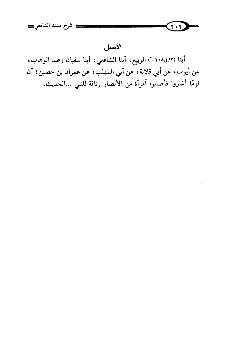 أبنا الربيع، أبنا الشافعي، أبنا سفيان وعبد الوهاب، عن أيوب، عن أبي قلابة، عن أبي المهلب، عن عمران بن حصين؛ أن قومًا أغاروا فأصابوا امرأة من الأنصار وناقة للنبي ... الحديث.
