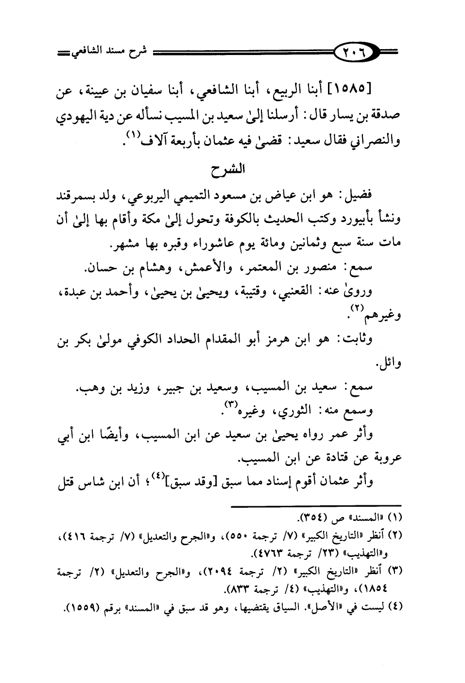 [1585] أبنا الربيع، أبنا الشافعي، أبنا سفيان بن عيينة، عن صدقة بن يسار قال: أرسلنا إلى سعيد بن المسيب نسأله عن دية اليهودي والنصراني فقال سعيد: قضى فيه عثمان بأربعة آلاف (¬1).
