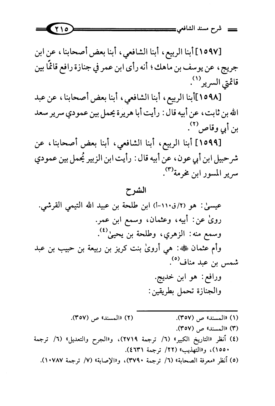 [1599] أبنا الربيع، أبنا الشافعي، أبنا بعض أصحابنا، عن شرحبيل ابن أبي عون، عن أبيه قال: رأيت ابن الزبير يُحمل بين عمودي سرير المسور ابن مخرمة (¬3).