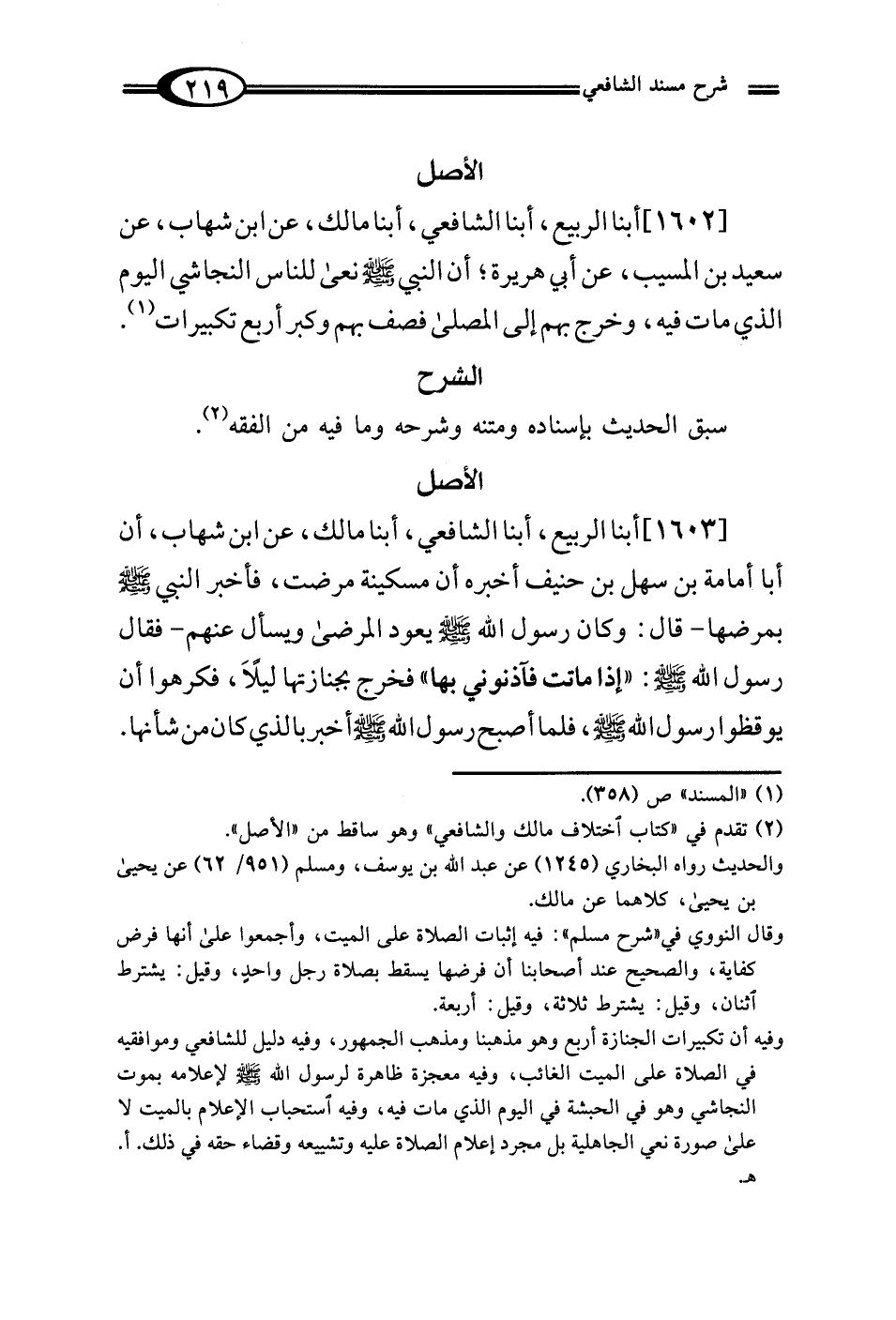 [1602] أبنا الربيع، أبنا الشافعي، أبنا مالك، عن ابن شهاب، عن سعيد بن المسيب، عن أبي هريرة؛ أن النبي - صلى الله عليه وسلم - نعى للناس النجاشي اليوم الذي مات فيه، وخرج بهم إلى المصلى فصف بهم وكبر أربع تكبيرات (¬1).
