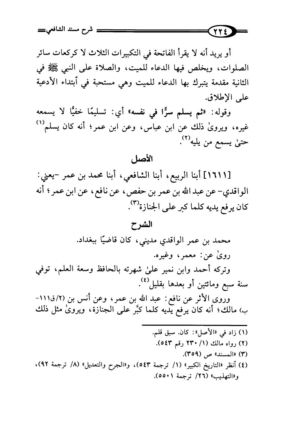 [1611] أبنا الربيع، أبنا الشافعي، أبنا محمَّد بن عمر -يعني: الواقدي- عن عبد الله بن عمر بن حفص، عن نافع، عن ابن عمر؛ أنه كان يرفع يديه كلما كبر على الجنازة (¬3).
