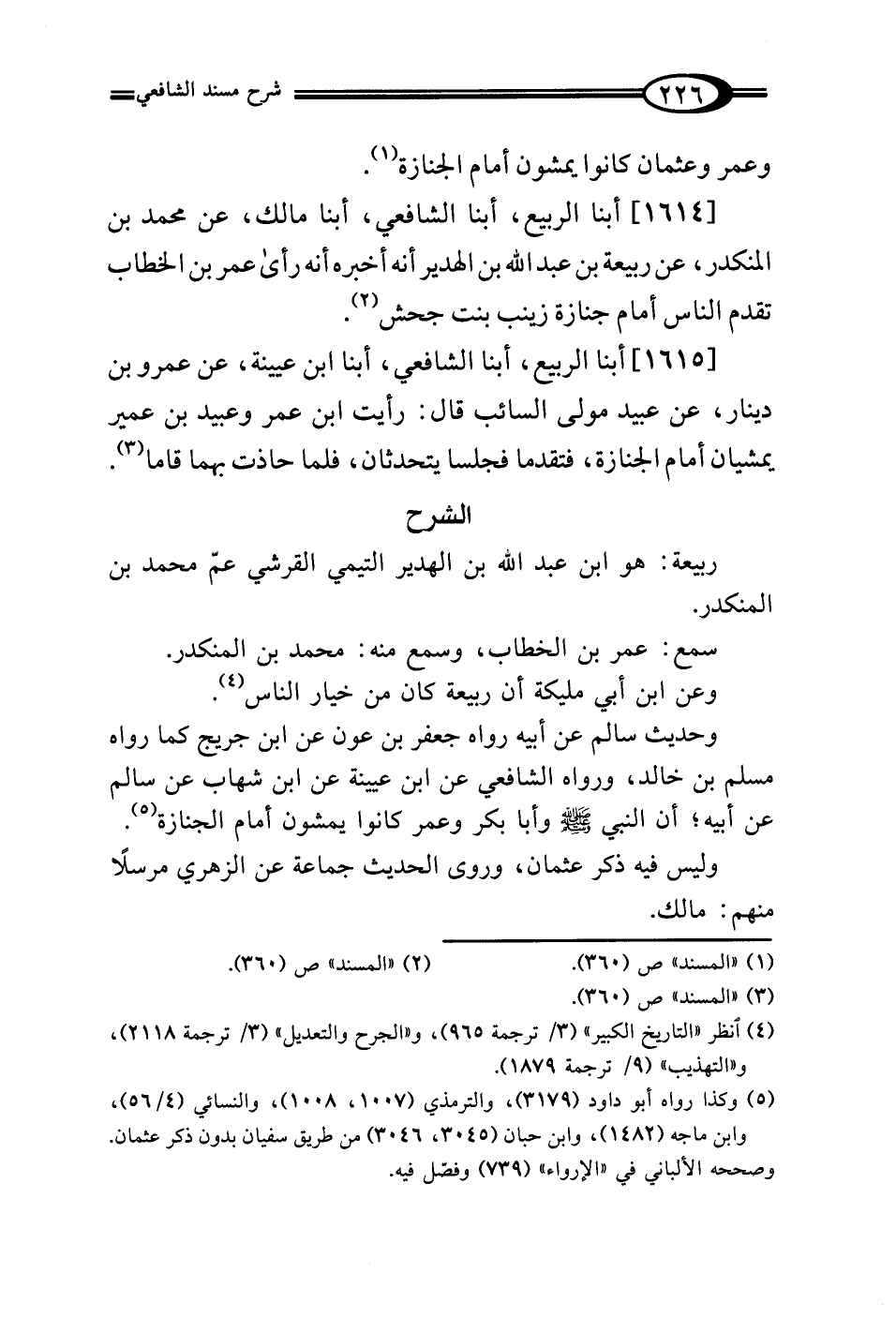 [1614] أبنا الربيع، أبنا الشافعي، أبنا مالك، عن محمَّد بن المنكدر، عن ربيعة بن عبد الله بن الهدير أنه أخبره أنه رأى عمر بن الخطاب تقدم الناس أمام جنازة زينب بنت جحش (¬2).