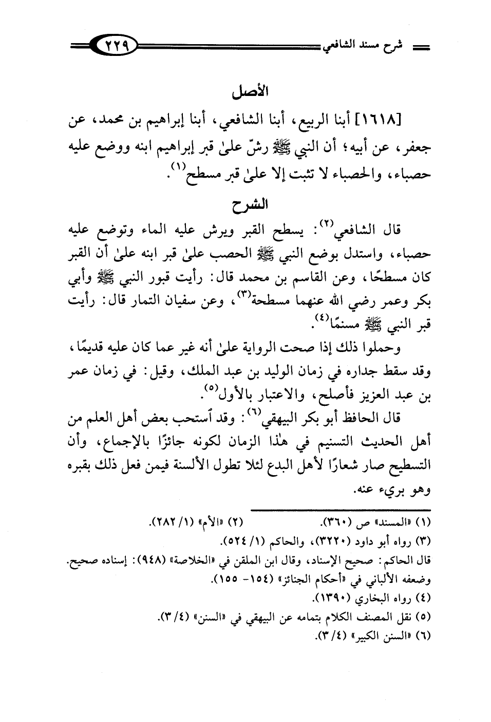 [1618] أبنا الربيع، أبنا الشافعي، أبنا إبراهيم بن محمَّد، عن جعفر، عن أبيه؛ أن النبي - صلى الله عليه وسلم - رشّ على قبر إبراهيم ابنه ووضع عليه حصباء، والحصباء لا تثبت إلا على قبر مسطح (¬1).