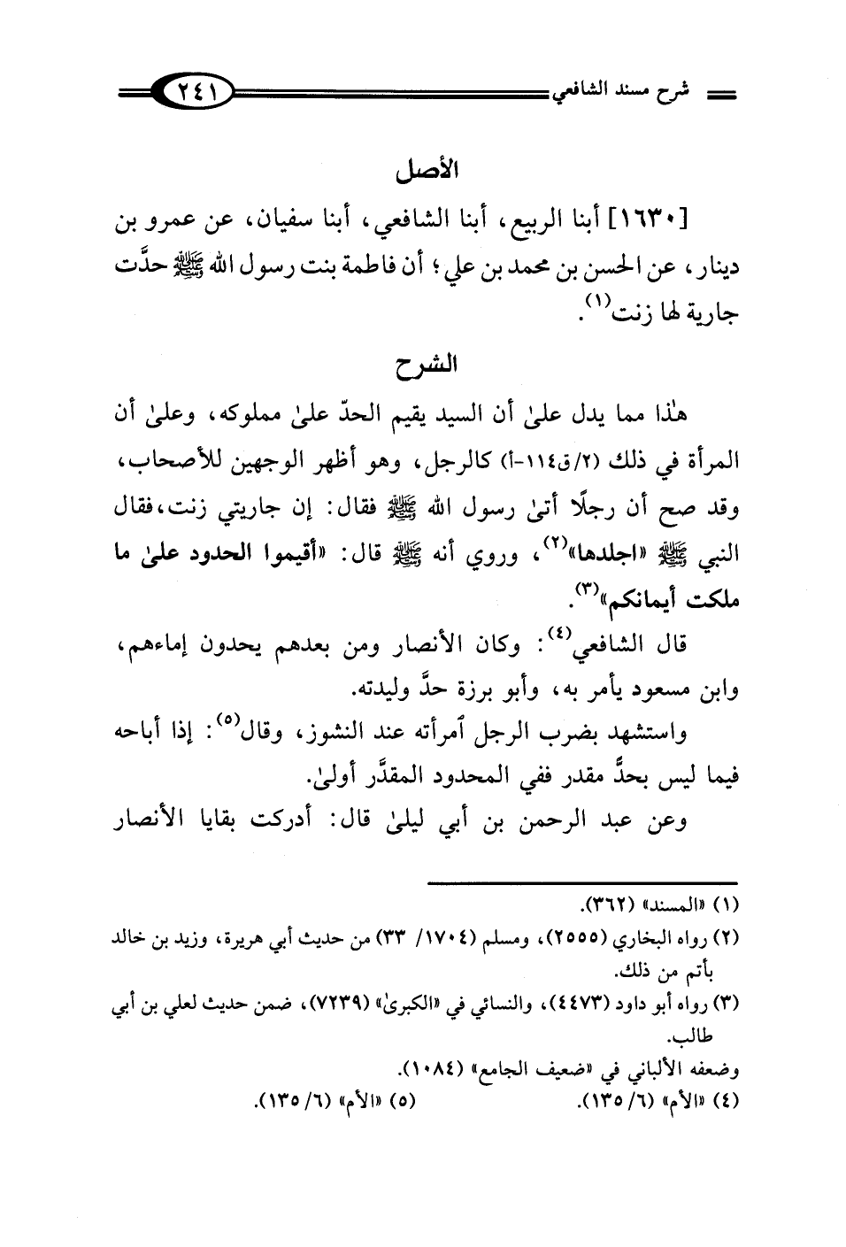 [1630] أبنا الربيع، أبنا الشافعي، أبنا سفيان، عن عمرو بن دينار، عن الحسن بن محمَّد بن علي؛ أن فاطمة بنت رسول الله - صلى الله عليه وسلم - حدَّت جارية لها زنت (¬1).