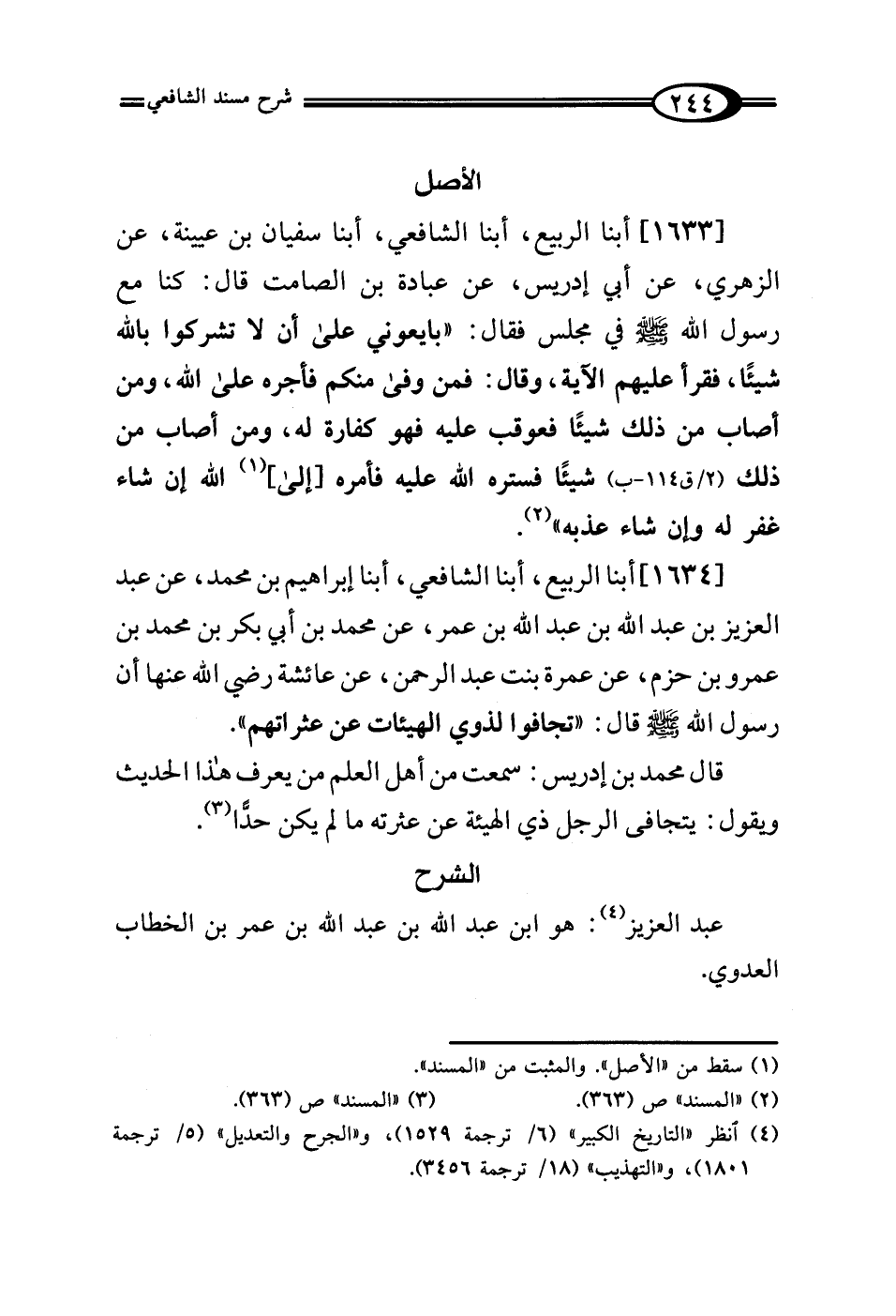 [1633] أبنا الربيع، أبنا الشافعي، أبنا سفيان بن عيينة، عن الزهري، عن أبي إدريس، عن عبادة بن الصامت قال: كنا مع رسول الله - صلى الله عليه وسلم - في مجلس فقال: "بايعوني على أن لا تشركوا بالله شيئًا، فقرأ عليهم الآية، وقال: فمن وفى منكم فأجره على الله، ومن أصاب من ذلك شيئًا فعوقب عليه فهو كفارة له، ومن أصاب من ذلك شيئًا فستره الله عليه فأمره [إلى] (¬1) الله إن شاء غفر له وإن شاء عذبه" (¬2).