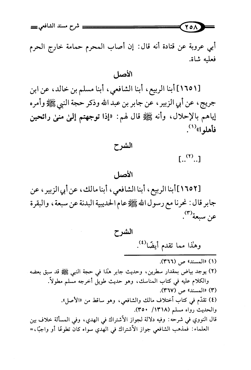 [1652] أبنا الربيع، أبنا الشافعي، أبنا مالك، عن أبي الزبير، عن جابر قال: نحرنا مع رسول الله - صلى الله عليه وسلم - عام الحديبية البدنة عن سبعة، والبقرة عن سبعة (¬3).