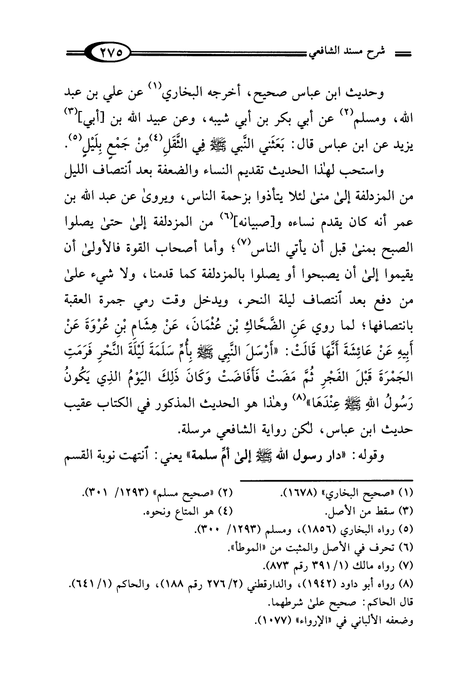 واستحب لهذا الحديث تقديم النساء والضعفة بعد انتصاف الليل من المزدلفة إلى منى لئلا يتأذوا بزحمة الناس، ويروى عن عبد الله بن عمر أنه كان يقدم نساءه و [صبيانه] (¬6) من المزدلفة إلى حتى يصلوا الصبح بمنى قبل أن يأتي الناس (¬7)، وأما أصحاب القوة فالأولى أن يقيموا إلى أن يصبحوا أو يصلوا بالمزدلفة كما قدمنا, ولا شيء على من دفع بعد انتصاف ليلة النحر، ويدخل وقت رمي جمرة العقبة بانتصافها؛ لما روي عَنِ الضَّحَّاكِ بْن عُثْمَانَ، عَنْ هِشَامِ بْنِ عُرْوَةَ عَنْ أَبِيهِ عَنْ عَائِشَةَ أَنَّهَا قَالَتْ: "أَرْسَلَ النَّبِي - صلى الله عليه وسلم - بِأُمِّ سَلَمَةَ لَيْلَةَ النَّحْرِ فَرَمَتِ الجَمْرَةَ قَبْلَ الفَجْرِ ثُمَّ مَضَتْ فَأَفَاضَتْ وَكَانَ ذَلِكَ اليَوْمُ الذِي يَكُونُ رَسُولُ اللهِ - صلى الله عليه وسلم - عِنْدَهَا" (¬8) وهذا هو الحديث المذكور في الكتاب عقيب حديث ابن عباس، لكن رواية الشافعي مرسلة.