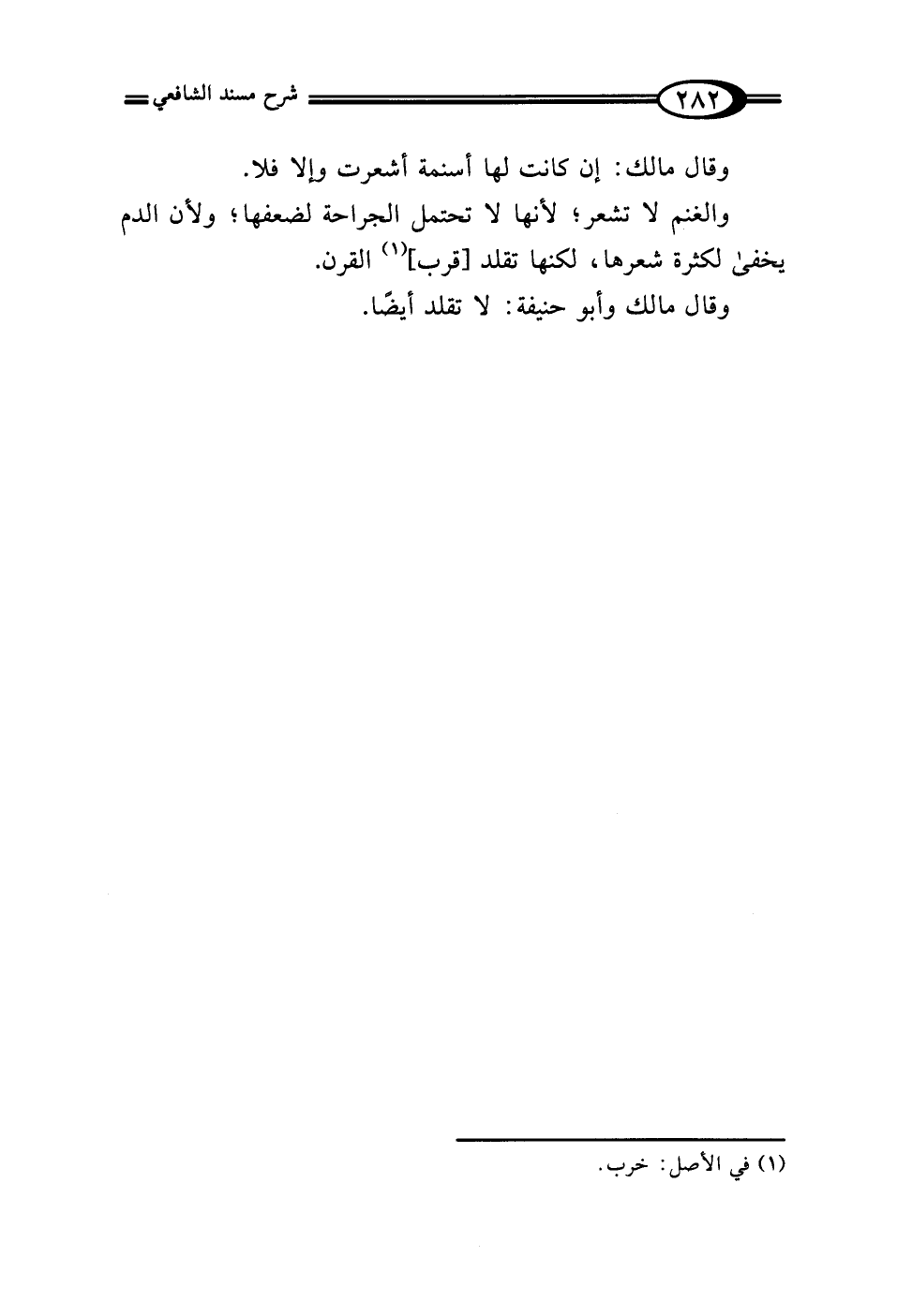 والغنم لا تشعر؛ لأنها لا تحتمل الجراحة لضعفها؛ ولأن الدم يخفى لكثرة شعرها, لكنها تقلد [قرب] (¬1) القرن.